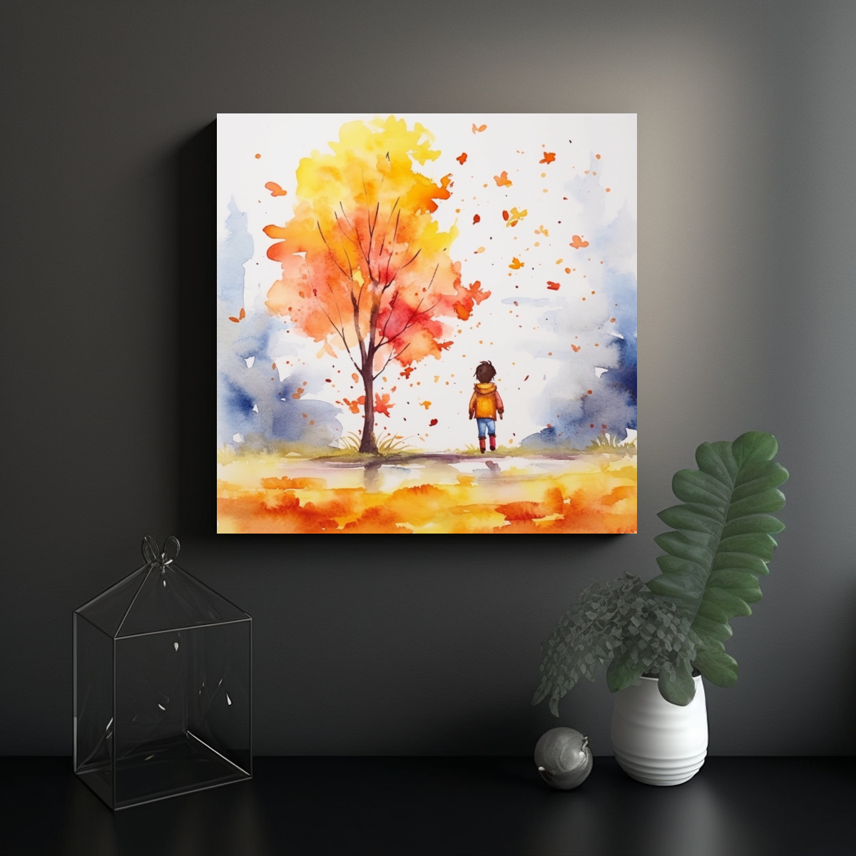 Este cuadro otoñal con niños en tonos cálidos se vería espectacular en la sala de estar sobre un sofá beige, creando un ambiente acogedor y familiar Combínalo con cojines en tonos similares para resaltar su belleza y darle un toque único a tu hogar
