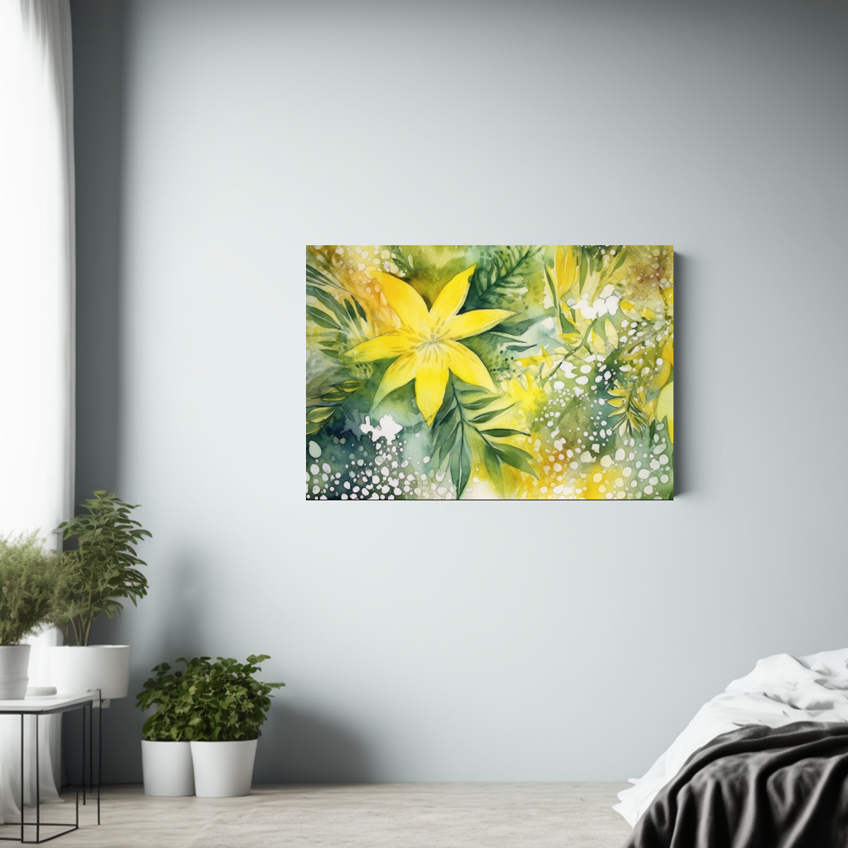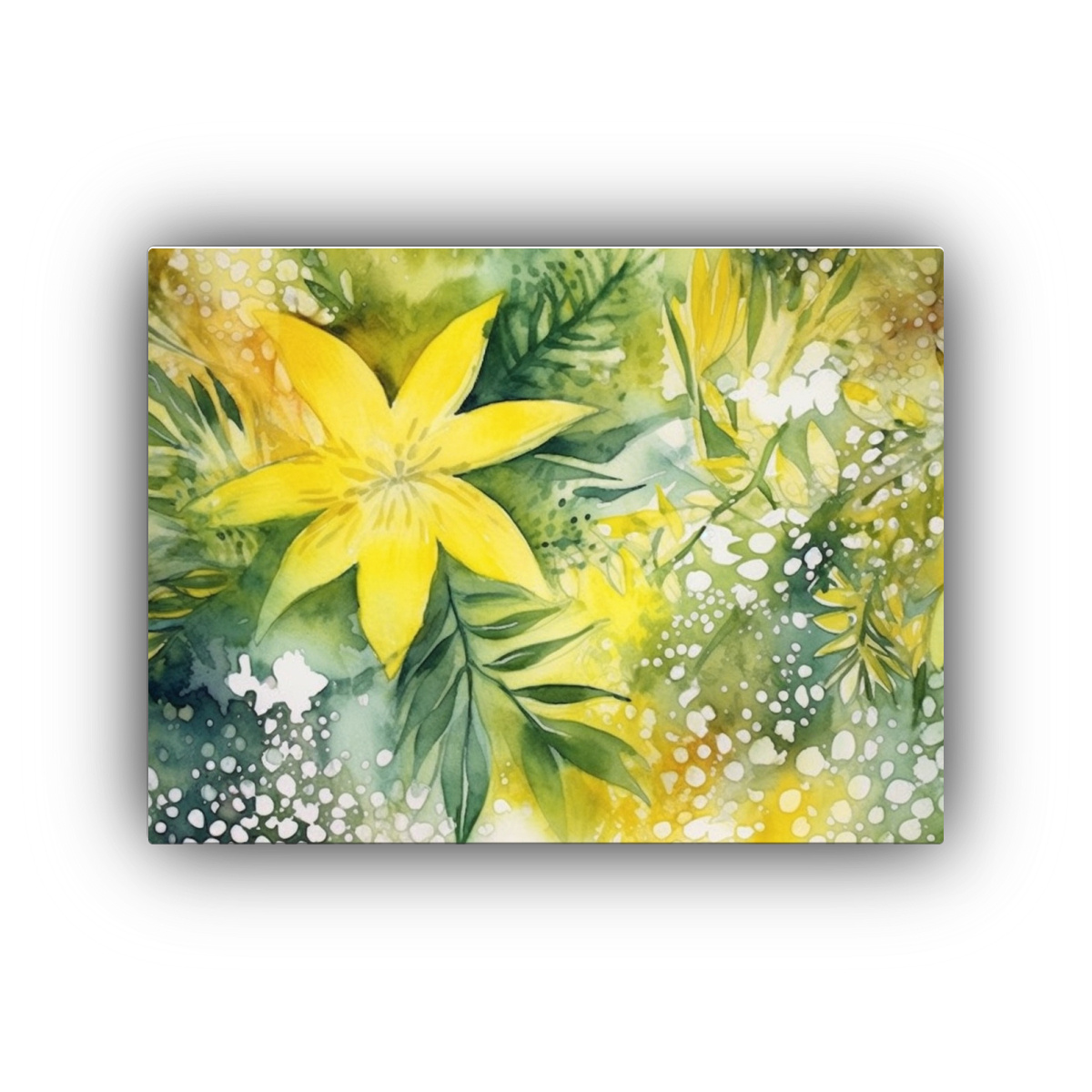 Este cuadro de acuarela shibori amarilla y blanca queda perfecto en la sala de estar, combinando con muebles de tonos neutros y accesorios en mostaza para dar un toque de color y elegancia