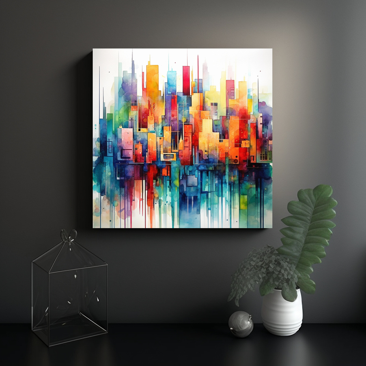 Coloca este cuadro en la pared principal de tu sala de estar y complementa la decoración con cojines en tonos coral y lila para crear un ambiente acogedor y elegante Asegúrate de que la iluminación resalte los colores vivos de la pintura acuarela urbana abstracta, ¡transformará por completo tu espacio!