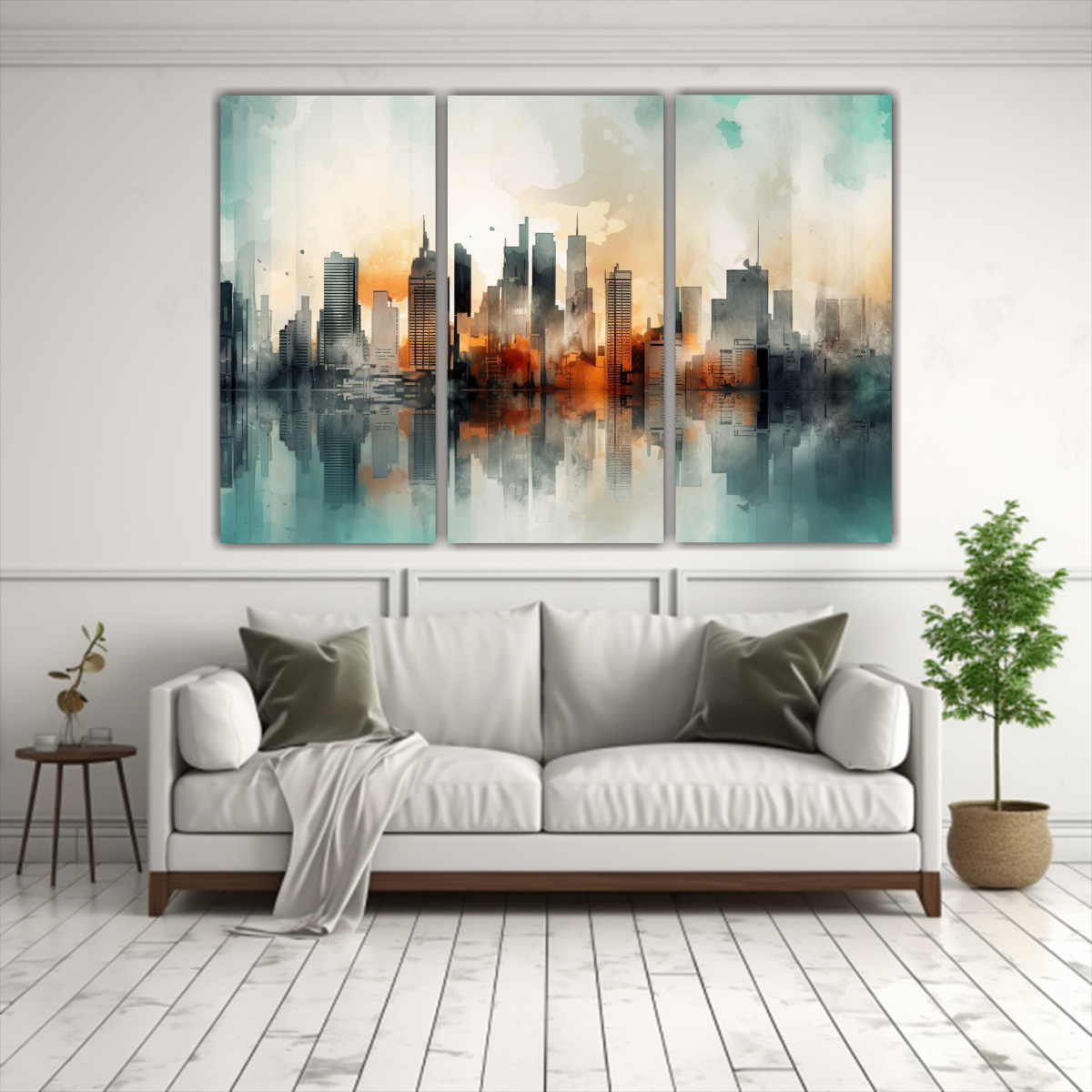Agrega un toque de modernidad a tu sala de estar con esta espectacular pintura acuarela urbana abstracta en tres cuadros cálidos Envíos rápidos y gratuitos en Santiago, ¡renueva tu espacio hoy!