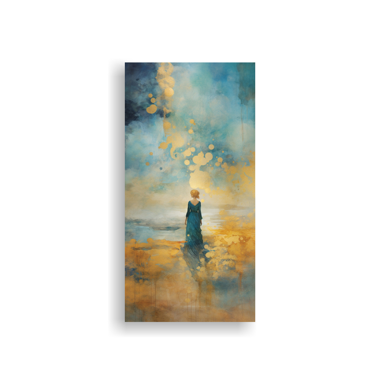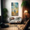 Coloca este cuadro acuarela vibrante en tonos turquesa y dorado en la pared detrás de tu escritorio, combinándolo con muebles y accesorios en colores neutros para resaltar su belleza y darle vida a tu espacio de trabajo