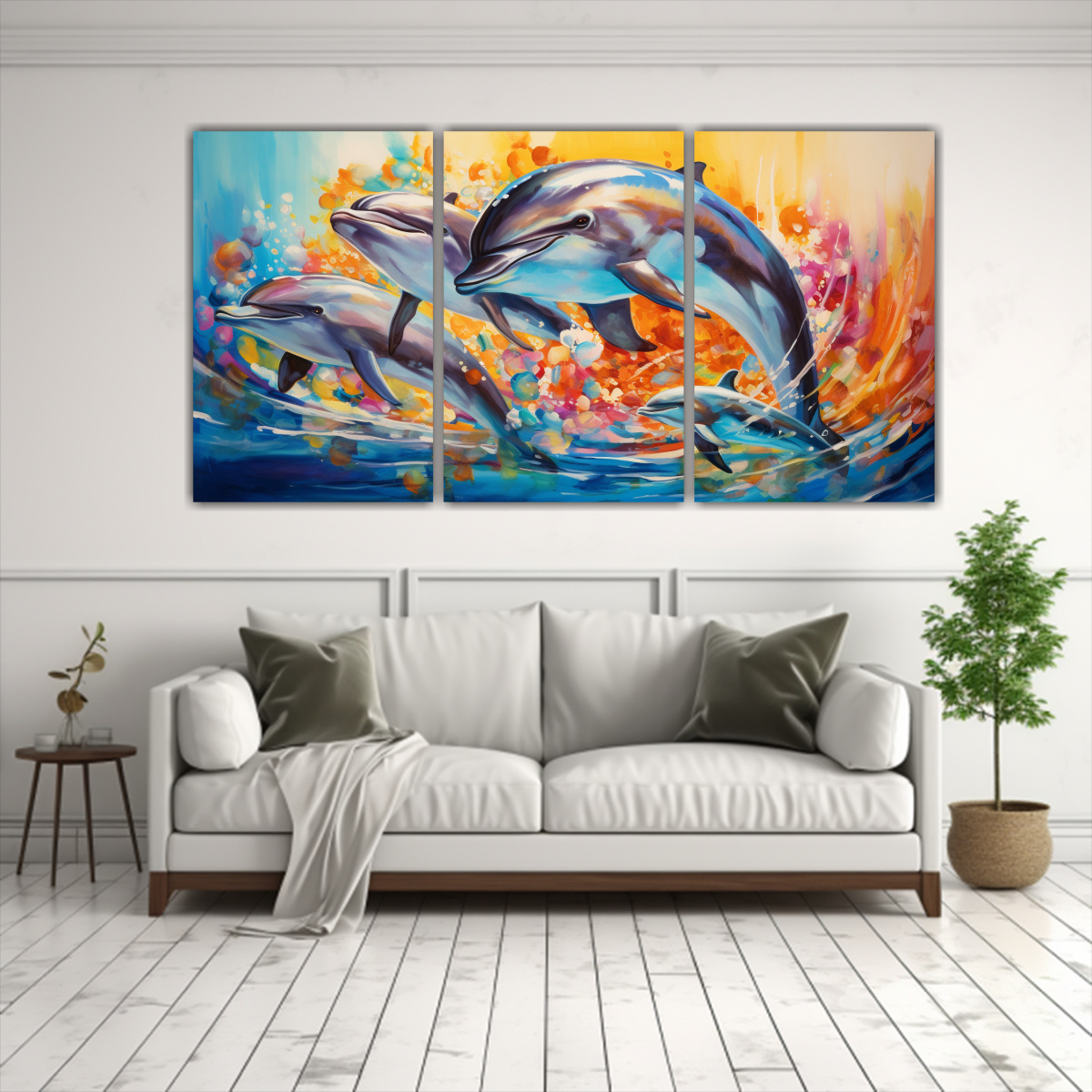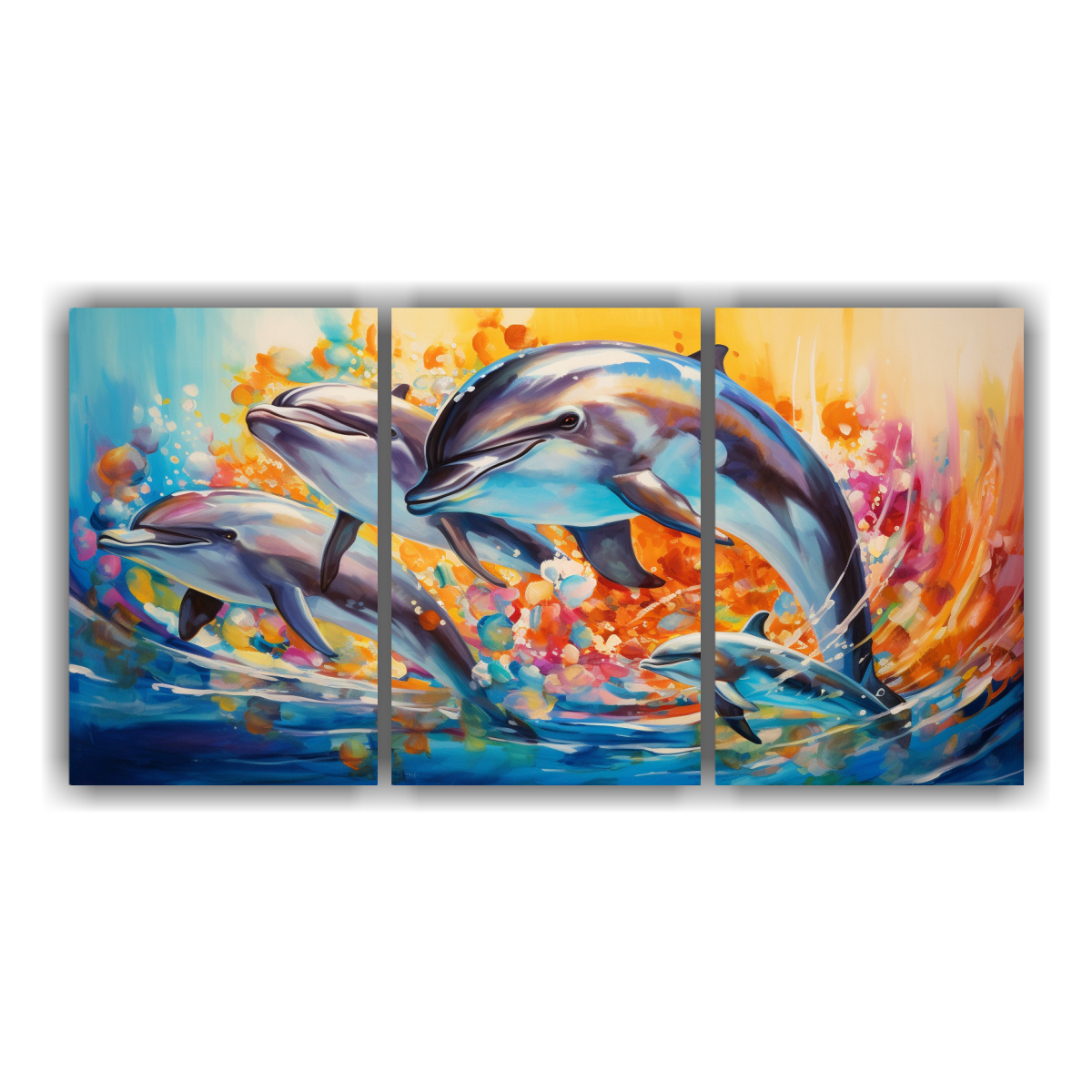 Este cuadro de delfines en estilo Estilo óleo colorido luciría espectacular en la sala de estar, creando un ambiente relajante y lleno de vida Combínalo con muebles en tonos neutros para resaltar sus colores vibrantes y darle un toque único a tu espacio