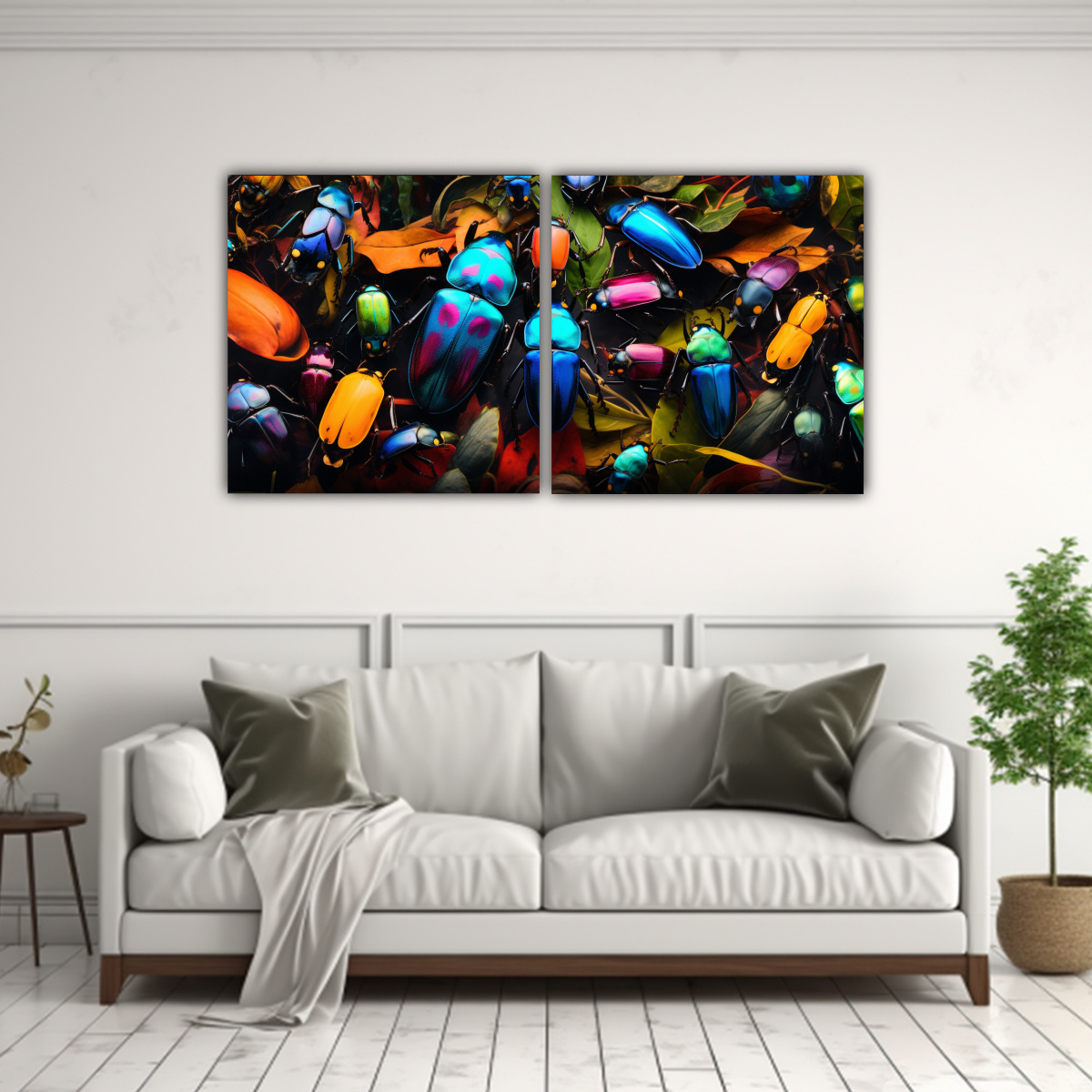 Pintura Al Estilo óleo Colorida Estilo Escarabajos En Dos Cuadros Horizontales 21×52