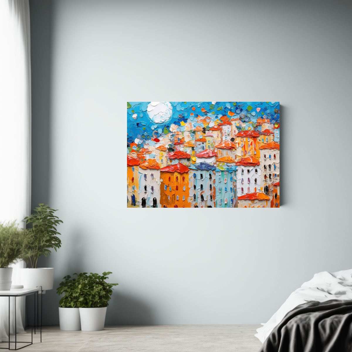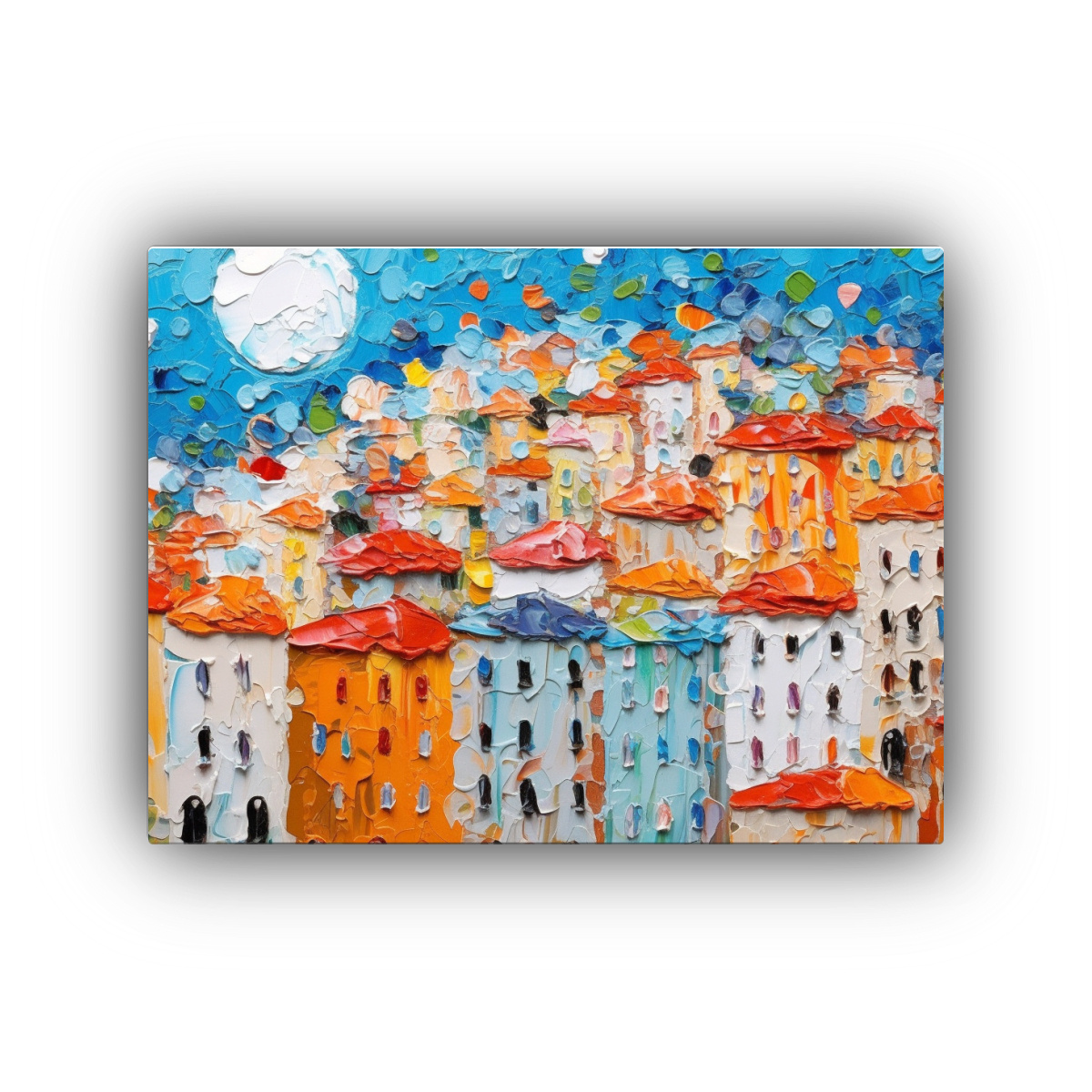Renueva tu espacio con esta pintura al estilo Estilo óleo que refleja una ciudad alegre y colorida La gruesa textura y los colores vibrantes de este cuadro le darán vida a cualquier ambiente Atrévete a decorar con un toque de alegría y sofisticación