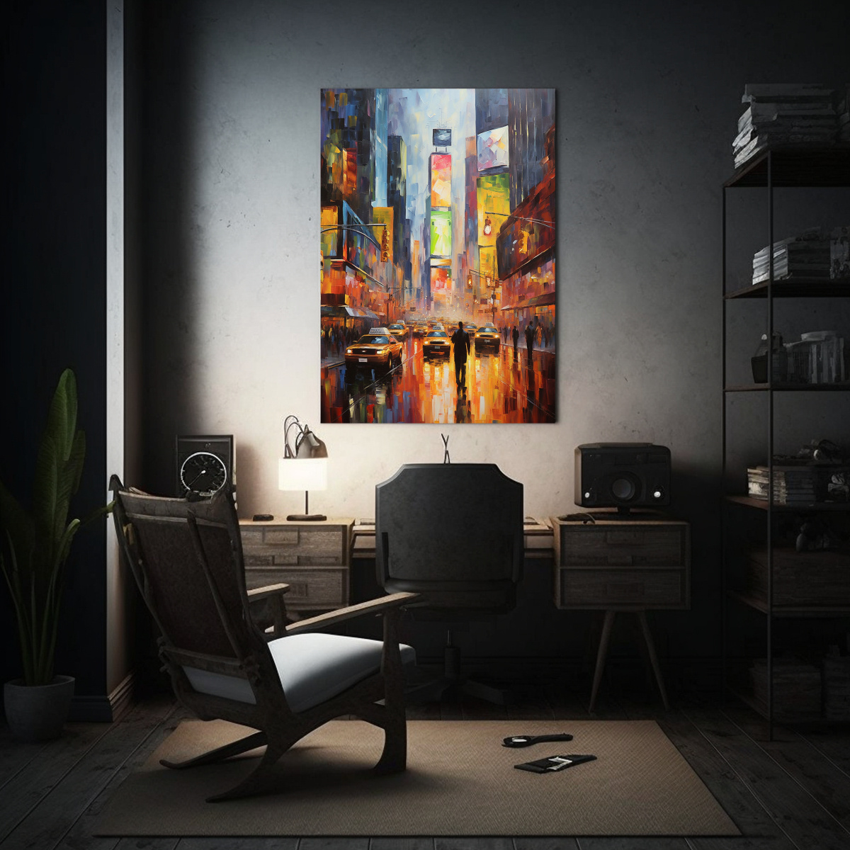 Este cuadro abstracto del Times Square de Nueva York en el estilo de Canva es perfecto para decorar una sala de estar moderna Colócalo sobre un sofá de color neutro para resaltar los tonos coral, plateado, azul marino grisáceo, carmesí, gris y chocolate Completa la decoración con cojines en colores complementarios y una alfombra de diseño contemporáneo ¡Crearás un ambiente único y lleno de estilo!