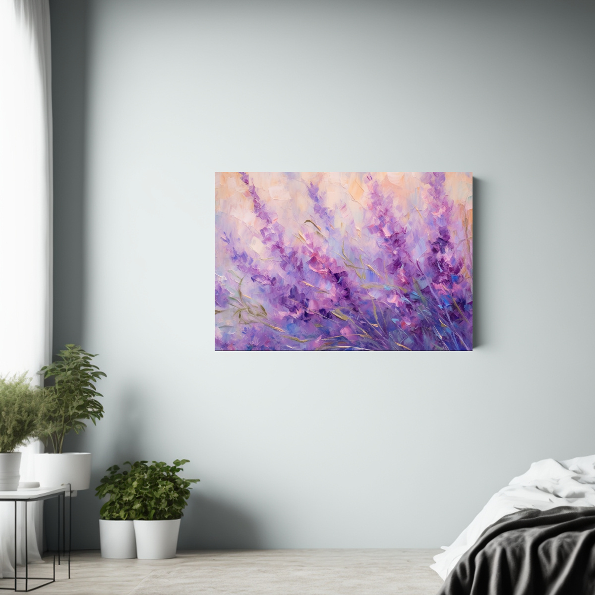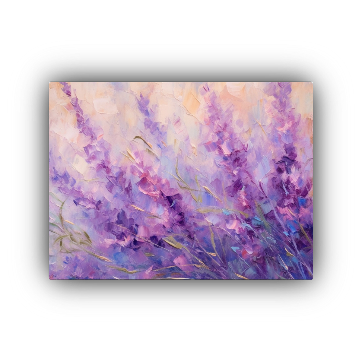 Llena tu espacio con la belleza de la pintura al Estilo óleo de ensueño floral de lavanda y hojas de lavanda Los tonos lila, indigo y violeta se mezclan con beige, gris y rosado claro para crear una atmósfera hazy y dreamy Aporta un toque de serenidad y elegancia a tu hogar