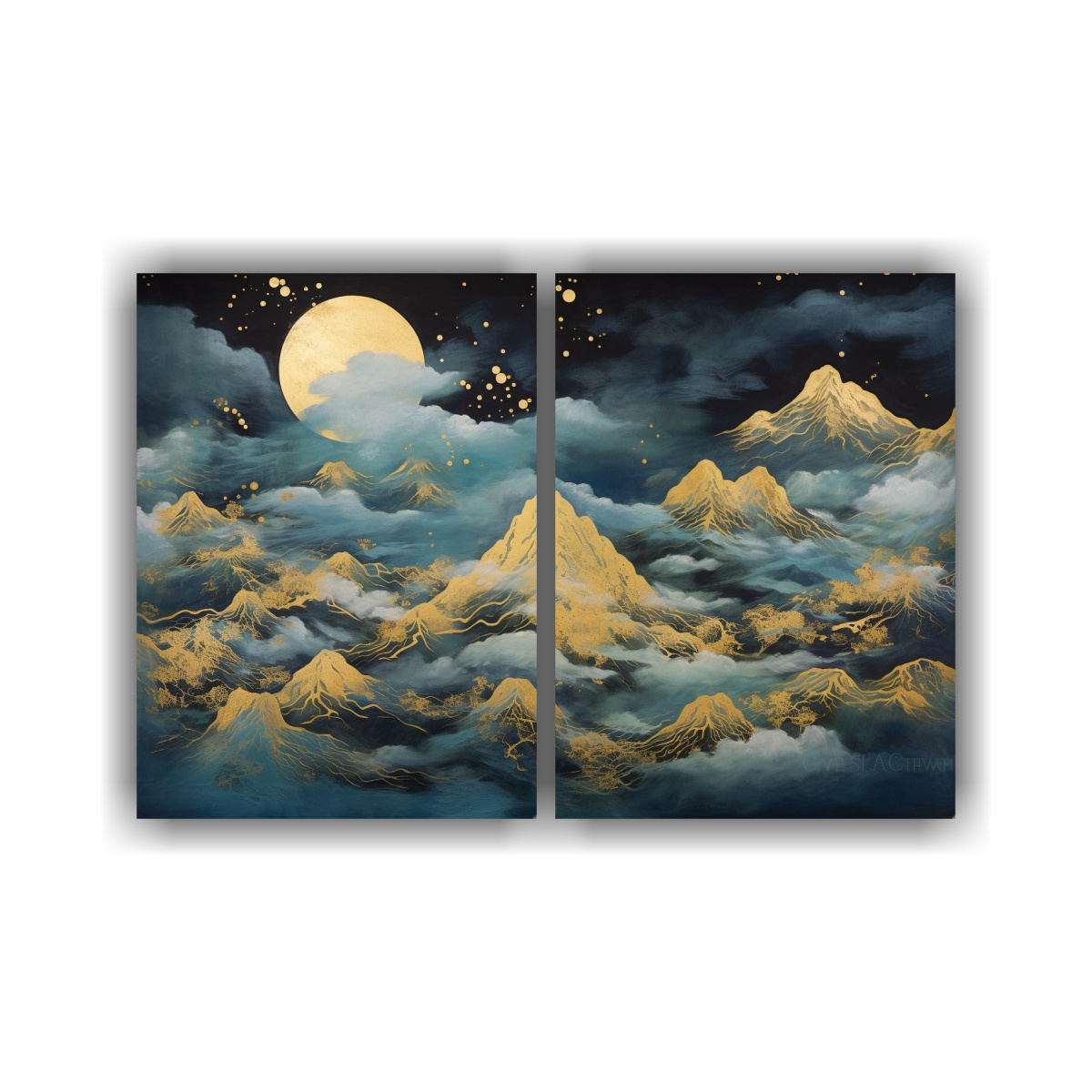 Este cuadro brillante con montaña, nubes y luna sería perfecto como pieza central en la sala de estar sobre un sofá de color claro para destacar su luminosidad Complementa con cojines en tonos plateados y azules para lograr una armonía visual y un ambiente acogedor