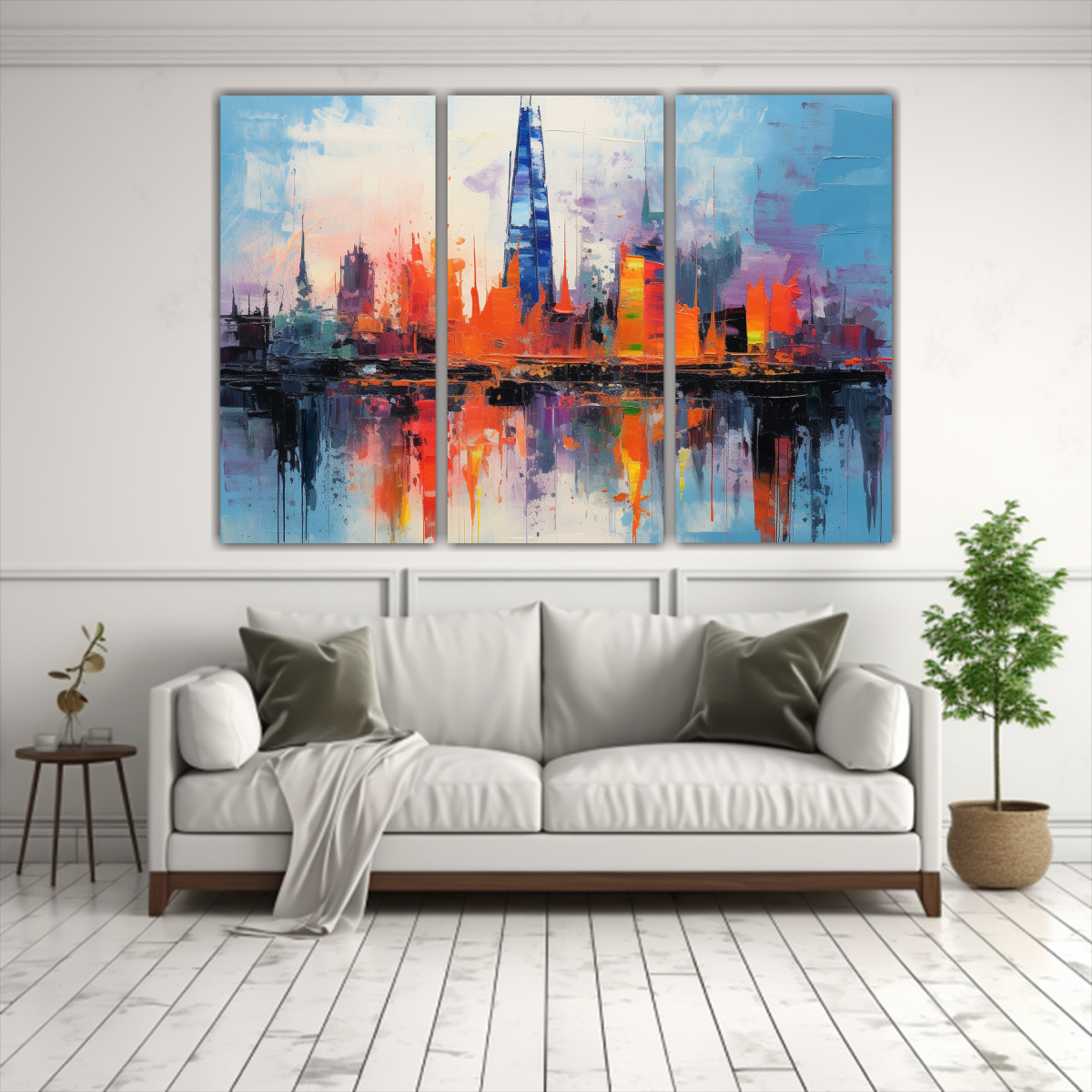 Añade un toque de elegancia a tu sala de estar con esta pintura al estilo Estilo óleo húmedo del horizonte urbano de Londres Los tonos azul marino grisáceo, coral y menta crearán un ambiente moderno y sofisticado en tu hogar