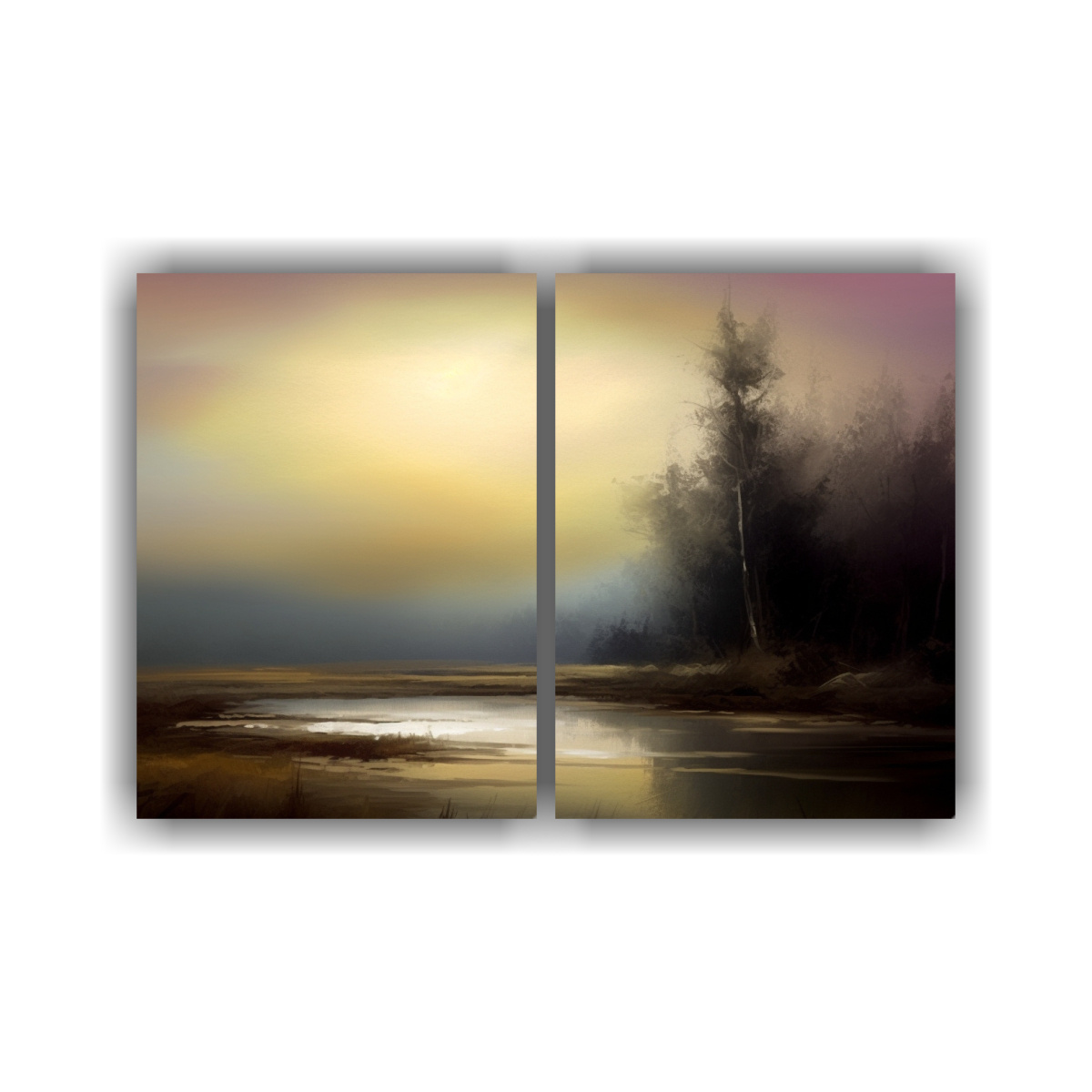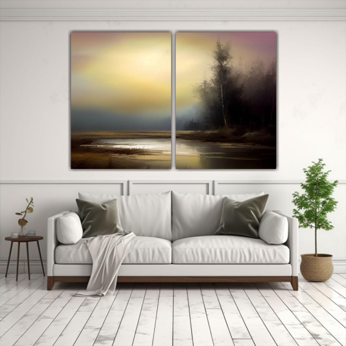 Este cuadro paisajístico al estilo Estilo óleo con niebla densa y fondo simplificado sería ideal para colocar en la sala de estar sobre un sofá beige claro, creando un ambiente acogedor y elegante Combínalo con cojines en tonos azul marino y gris para resaltar su belleza