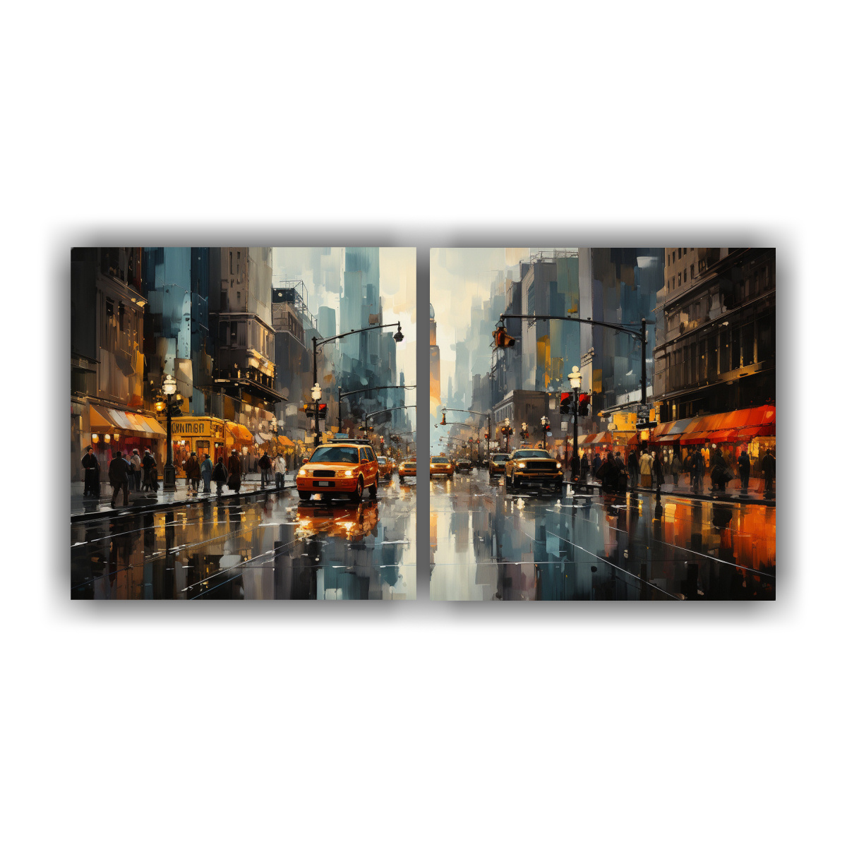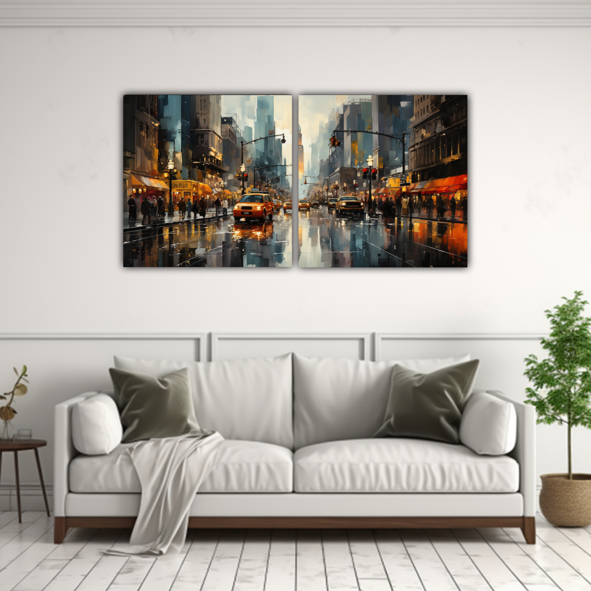 El cuadro Pintura Ciudad Calle Hermosa Variada en Set 2 Composiciones muestra una calle de la ciudad pintada en diversos tonos plateados, azul marino grisáceo, dorado, gris, carmesí y coral DecoCuadros ofrece cuadros decorativos impresos en tela de alta calidad con bastidores de madera, entregas rápidas y gratuitas en Santiago y envíos express a regiones
