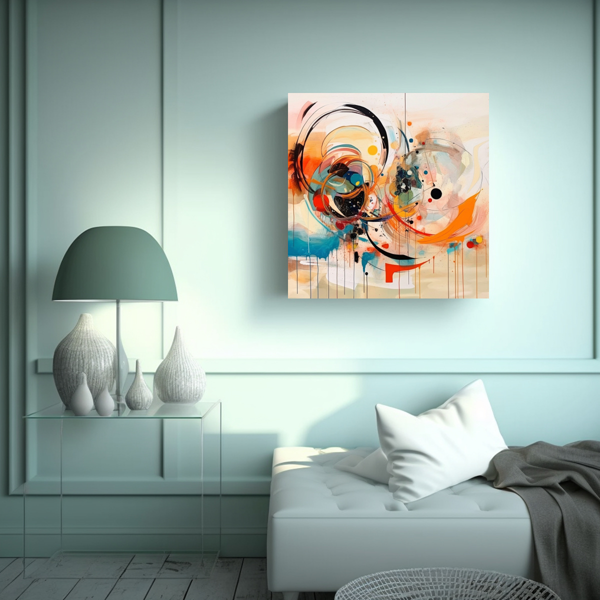 Combina este cuadro contemporáneo abstracto JoJo con tonos grises y azules en un ambiente moderno o minimalista Ideal para la sala de estar o el estudio