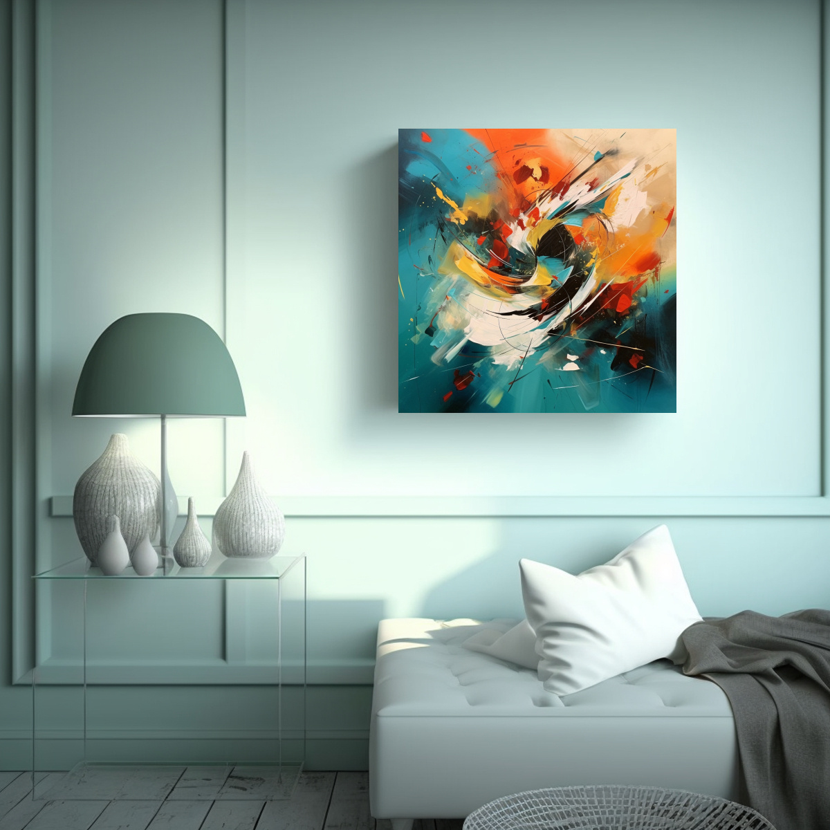 DecoCuadros ofrece la mejor calidad y precios económicos en cuadros decorativos impresos en tela de alta calidad con bastidores de madera Nuestro cuadro ‘Pintura contemporánea abstracta JoJo para decoración con diseño inspirador Canva Moderno’ combina los colores Plateado, Verde Azulado, Negro, Coral, Gris, Carmesí, Azul Marino grisáceo, Turquesa y Menta Con diseños exclusivos y entregas rápidas y gratuitas en Santiago, somos la mejor opción para decorar tu hogar