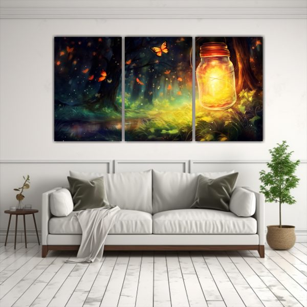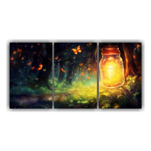 Pintura Creativa Con Tres Telas En Bastidor Estilo Acuarela Con Luciérnagas.