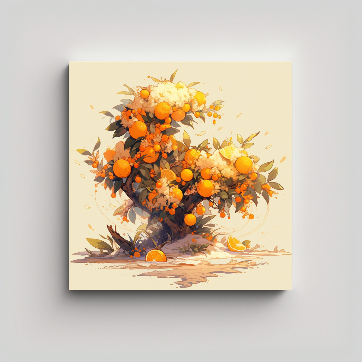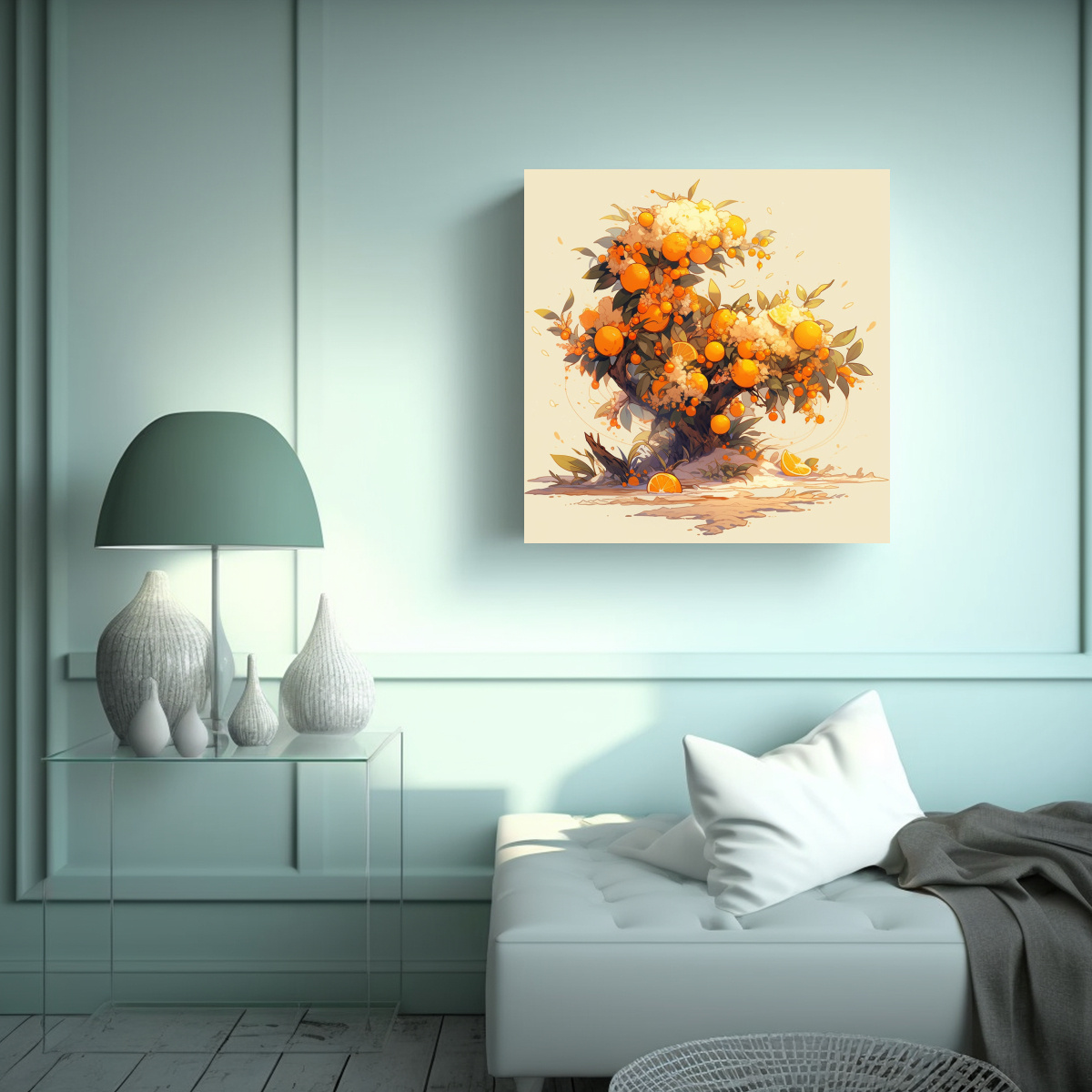 Pintura Creativa En Bastidor De Tela A Todo Color De Un árbol Naranja En Colores Amarillos, Ambiente Neonoir Y Estilo Neo Poético