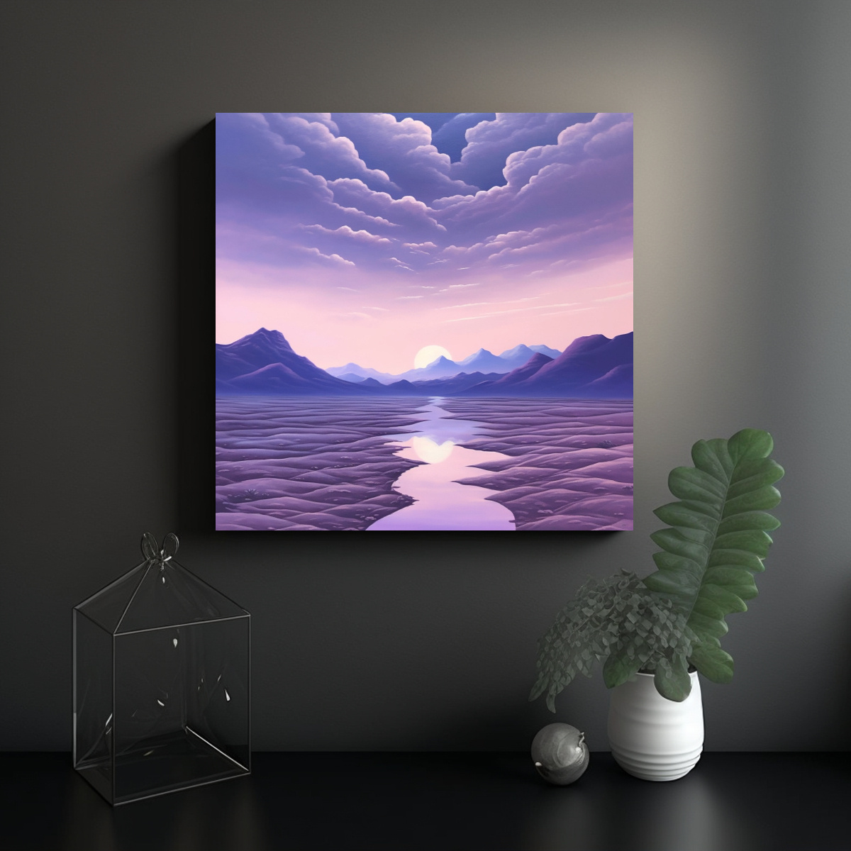 Coloca este cuadro minimalista en una pared blanca junto a muebles de líneas limpias y colores neutros para lograr un ambiente moderno y sofisticado Complementa con elementos decorativos en tonos plateados y violetas para crear un espacio armonioso y elegante