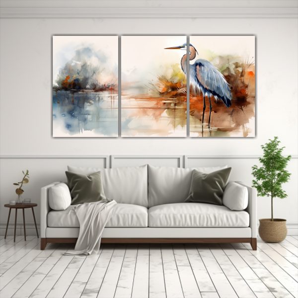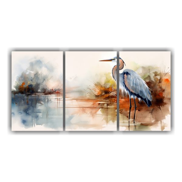 Pintura De 3 Tela En Bastidor Con Forma Linda De Garza: Acuarelas Coloridas