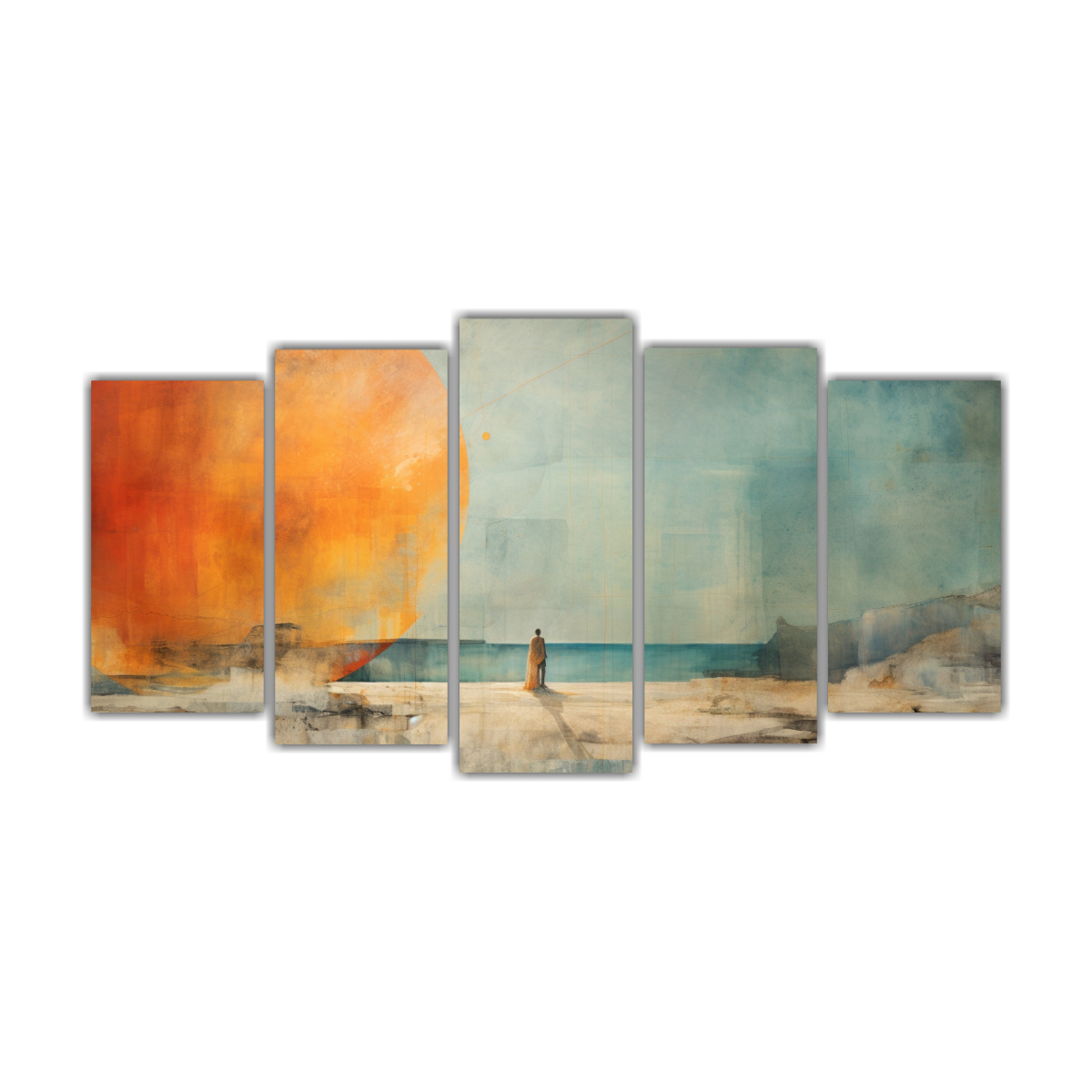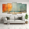 Pintura De Alta Calidad En Lienzo Para Dormitorio Con Acuarela En Tonos Naranja, Turquesa Y Plateado