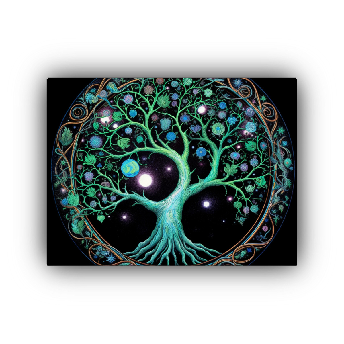 La composición inspiradora del árbol de la vida en negro estrellado con tonos menta, plateado, azul marino grisaceo, verde y más, es ideal para dar un toque de elegancia y misticismo a tu hogar Aprovecha la calidad y exclusividad de nuestros cuadros