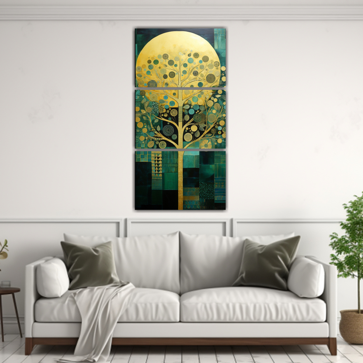 Pintura De árbol En Verde Y Amarillo En Decoración Con 3 Lienzos De Tela