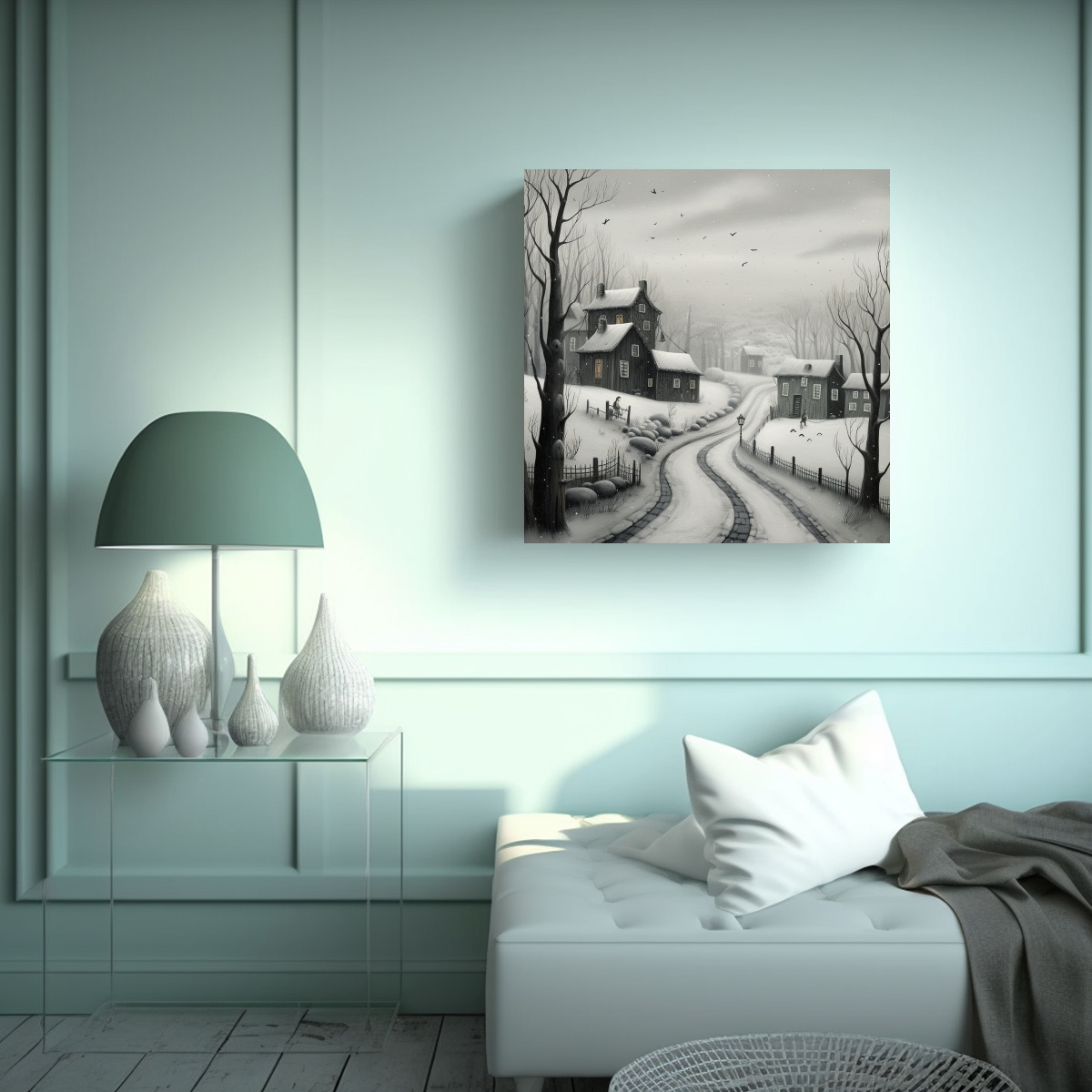 Este cuadro de paisaje nevado con atmósfera gris sería perfecto para decorar tu sala de estar Colócalo en una pared blanca para resaltar sus tonos plateados y grises Combínalo con cojines y mantas en tonos azul marino grisaceo y beige para crear una atmósfera acogedora y elegante ¡Agrega un toque estético a tu hogar con este cuadro de DecoCuadros!