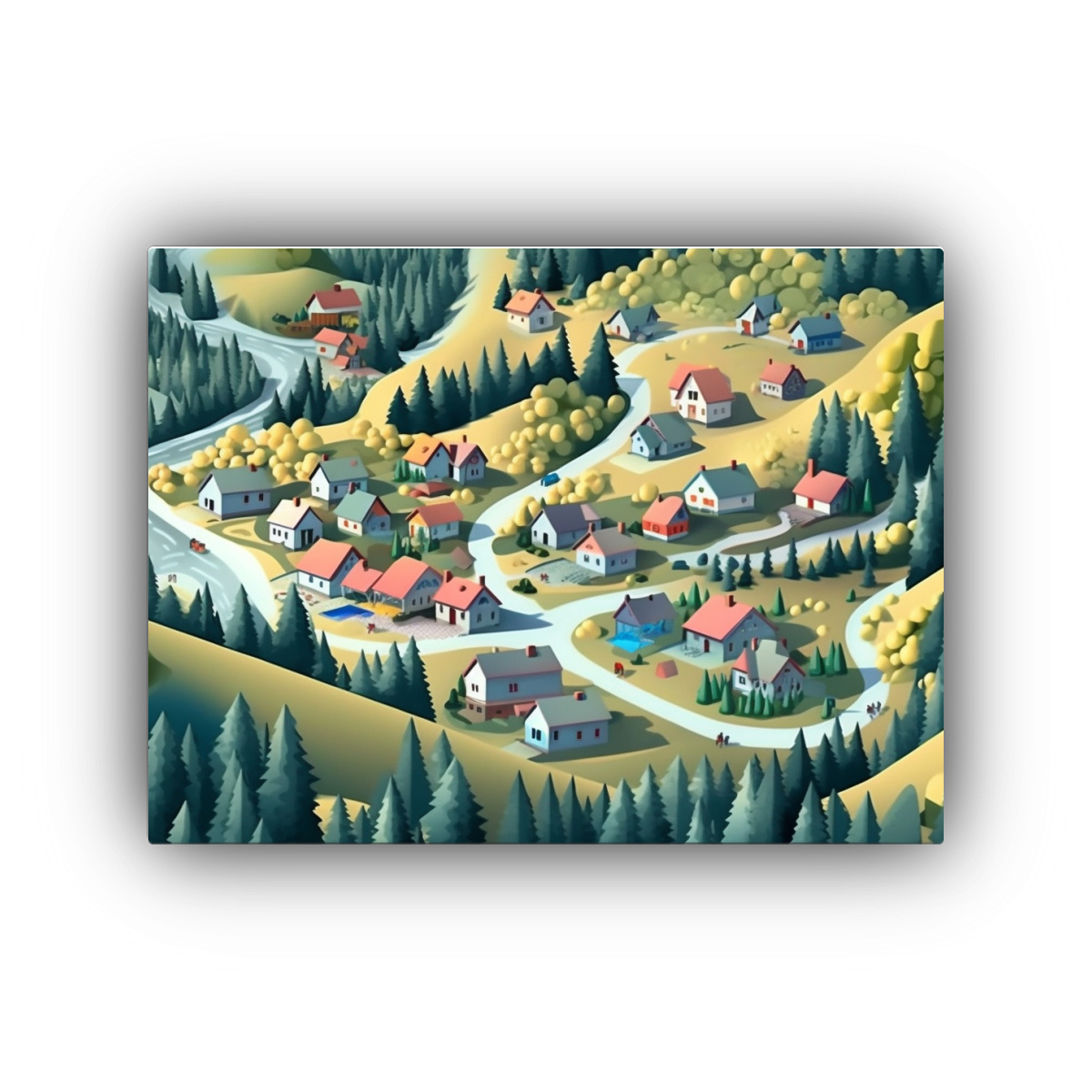 Este cuadro isométrico de invierno en lienzo luciría espectacular en la sala de estar sobre un sofá de color neutro, resaltando la armonía cromática con cojines en tonos azules y grises ¡Añade un toque elegante y acogedor a tu hogar con esta pieza única!