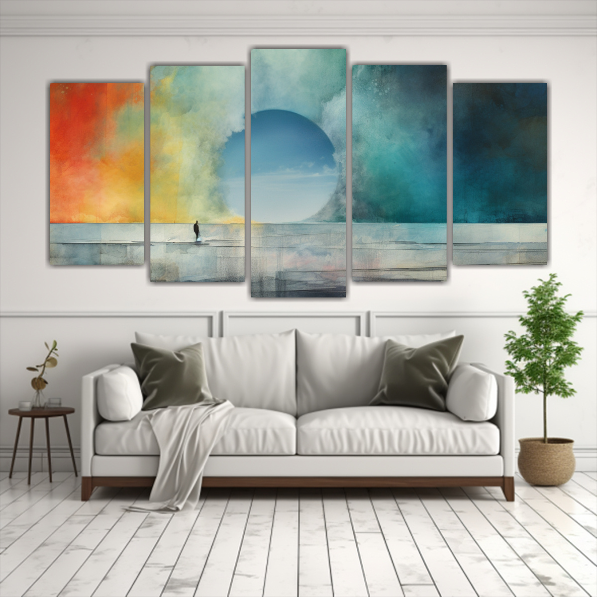 El cuadro de Belleza en Bastidor con Cinco Telas en Colores Teal y Plateado es ideal para añadir elegancia y estilo a tu decoración Sus colores azul marino grisaceo, gris, carmesí, coral, plateado y menta se complementan a la perfección, creando un efecto visual impactante Además, su fabricación con materiales de alta calidad garantiza durabilidad y resistencia