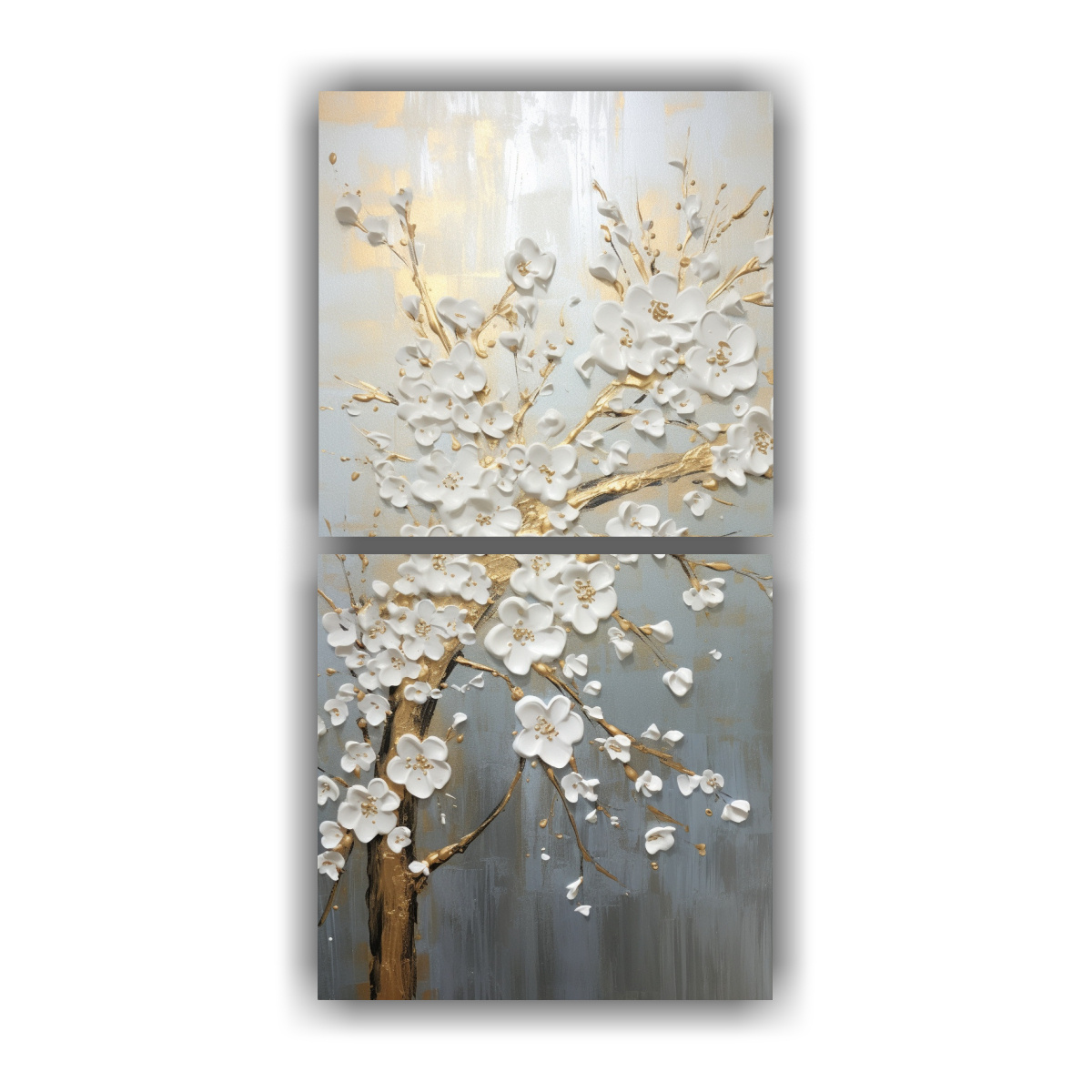 Pintura De Cerezos En Oro Sobre Lienzo De Patrón Intenso En Decoración De Dos Lienzos De Tela