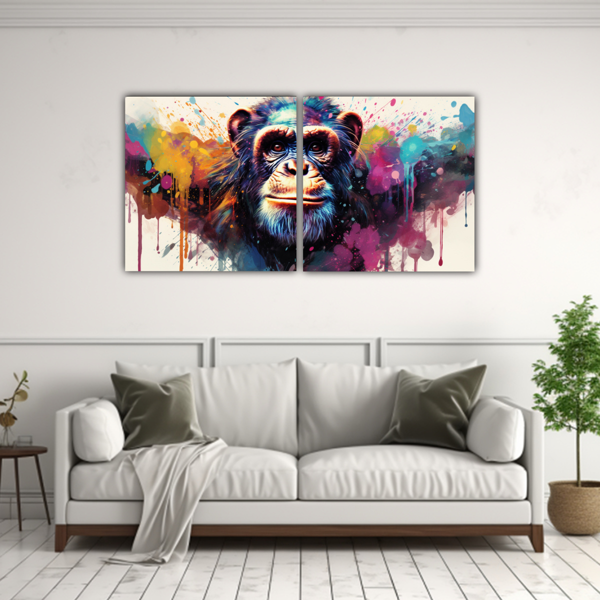 El cuadro ‘Pintura de Chimpancé en acuarelas coloridas en estilo armonioso’ presenta una combinación de colores Carmesí, Azul Marino grisáceo, Gris, Coral, Beige, Menta, Plateado y Verde Azulado Diseño exclusivo de nuestra tienda impreso en tela de alta calidad Atrévete a añadir armonía y color a tus espacios