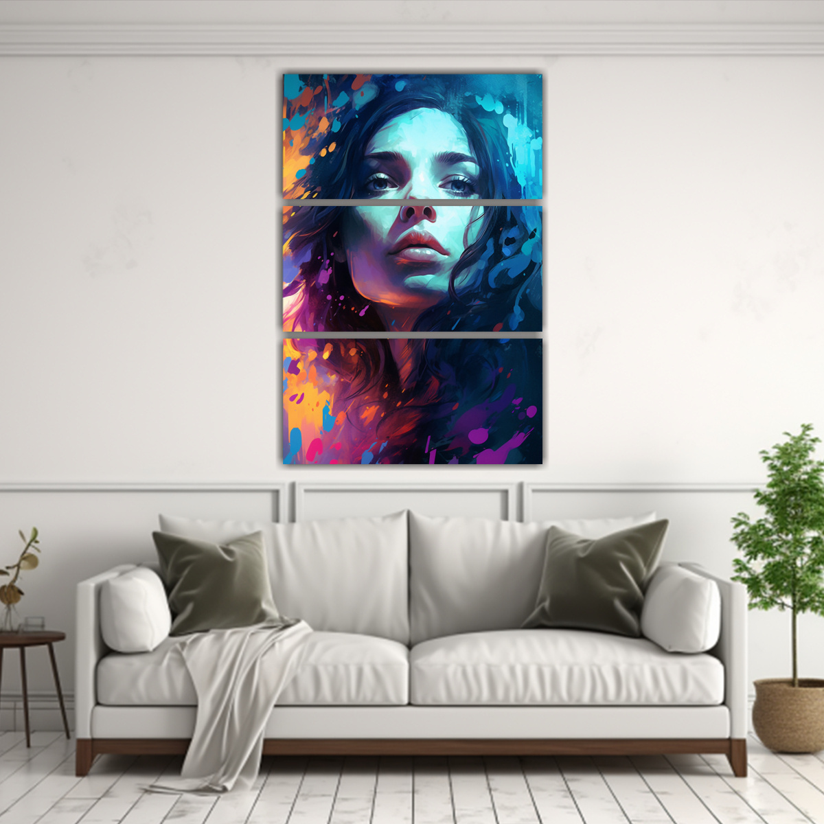 Este cuadro simétrico de una joven hermosa con cabello negro en tres lienzos de tela es perfecto para decorar cualquier espacio Puede ser colocado en un dormitorio, sala de estar o incluso en una oficina Combina este cuadro con muebles en tonos neutros para crear un contraste elegante ¡Agregará un toque de sofisticación y estilo a cualquier ambiente!