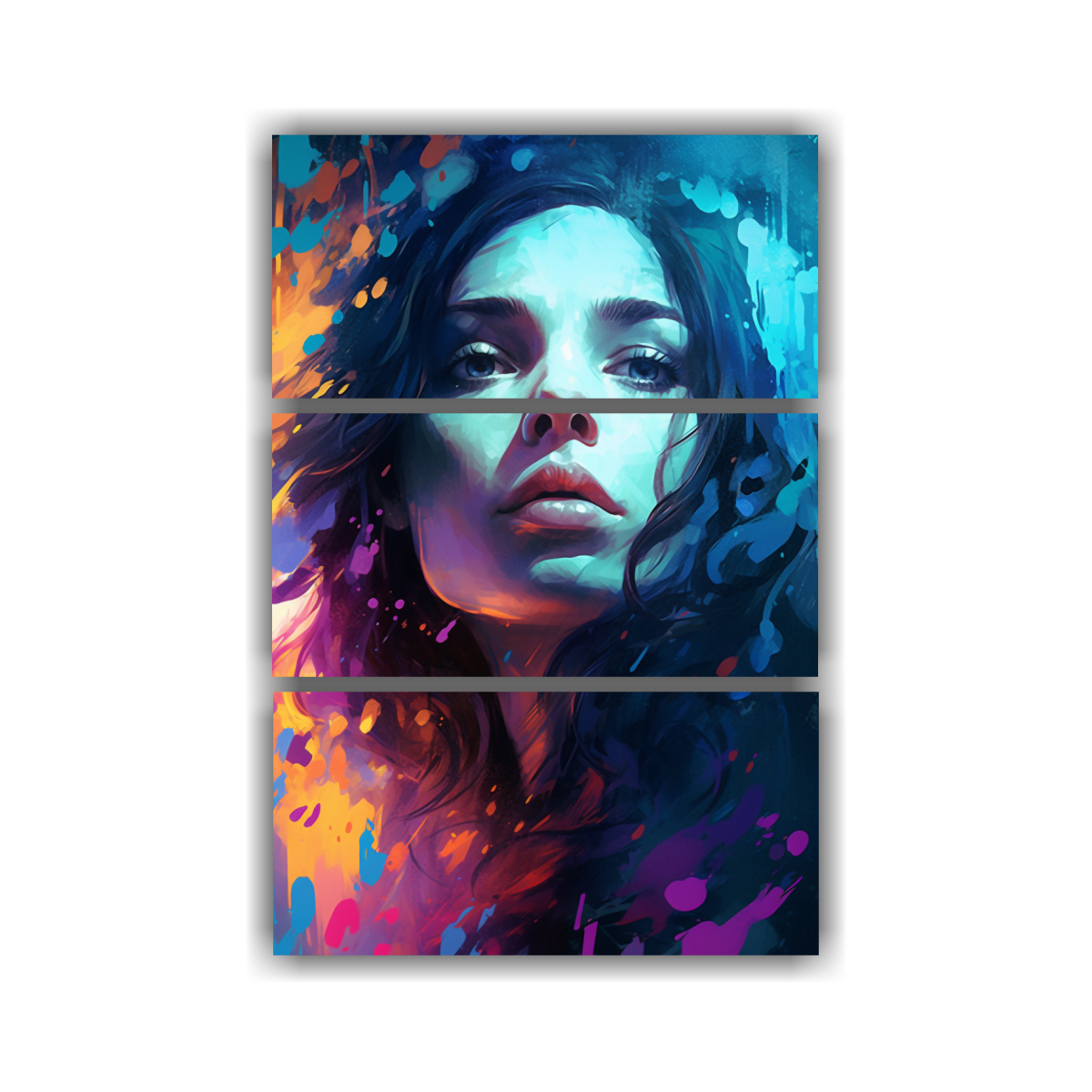 DecoCuadros ofrece un elegante cuadro simétrico de una joven hermosa con cabello negro en tres lienzos de tela en los colores Coral, Turquesa, Azul Marino grisaceo, Verde Azulado, Aguamarina y Carmesí Nuestros cuadros tienen la mejor calidad del mercado y los precios más económicos Realizamos entregas gratuitas en Santiago y envíos express a regiones