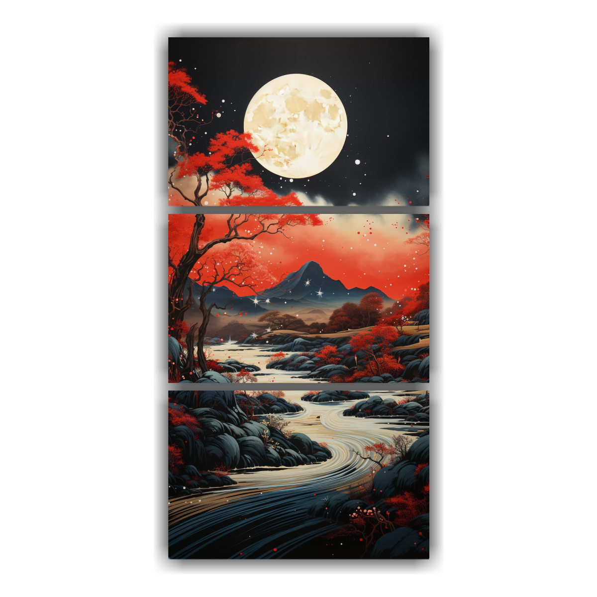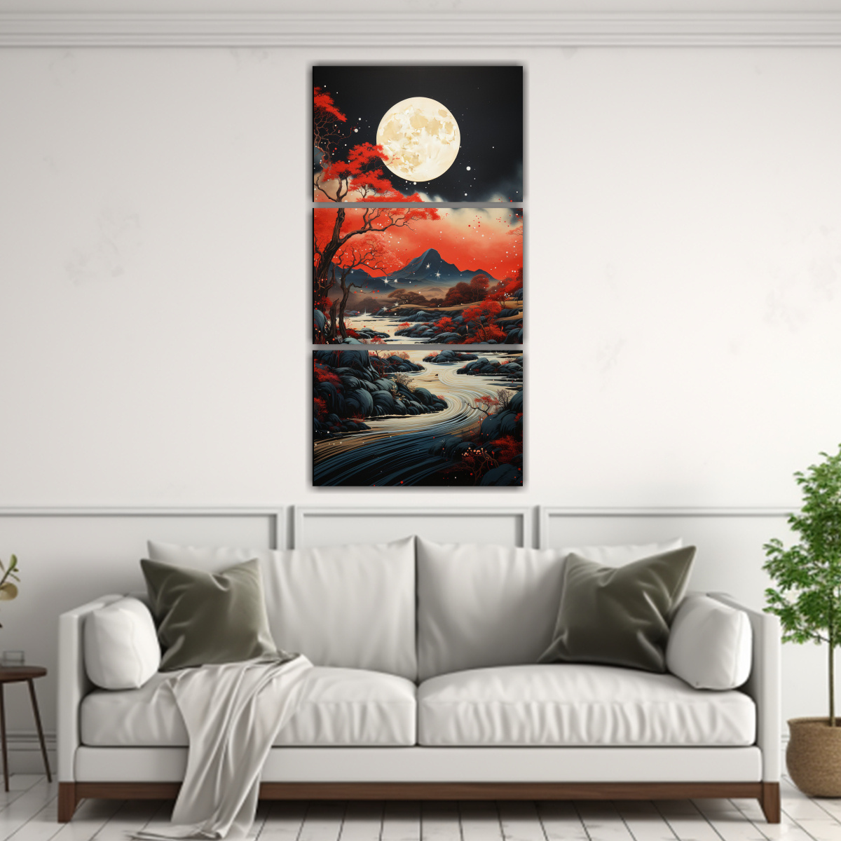Este cuadro con luna y montañas en lienzo es ideal para decorar tu sala de estar o dormitorio Colócalo sobre un sofá o una cabecera de cama para crear un ambiente relajante y mágico Combina los colores plateado, azul marino grisaceo, carmesí, dorado, coral y gris para obtener una decoración armoniosa