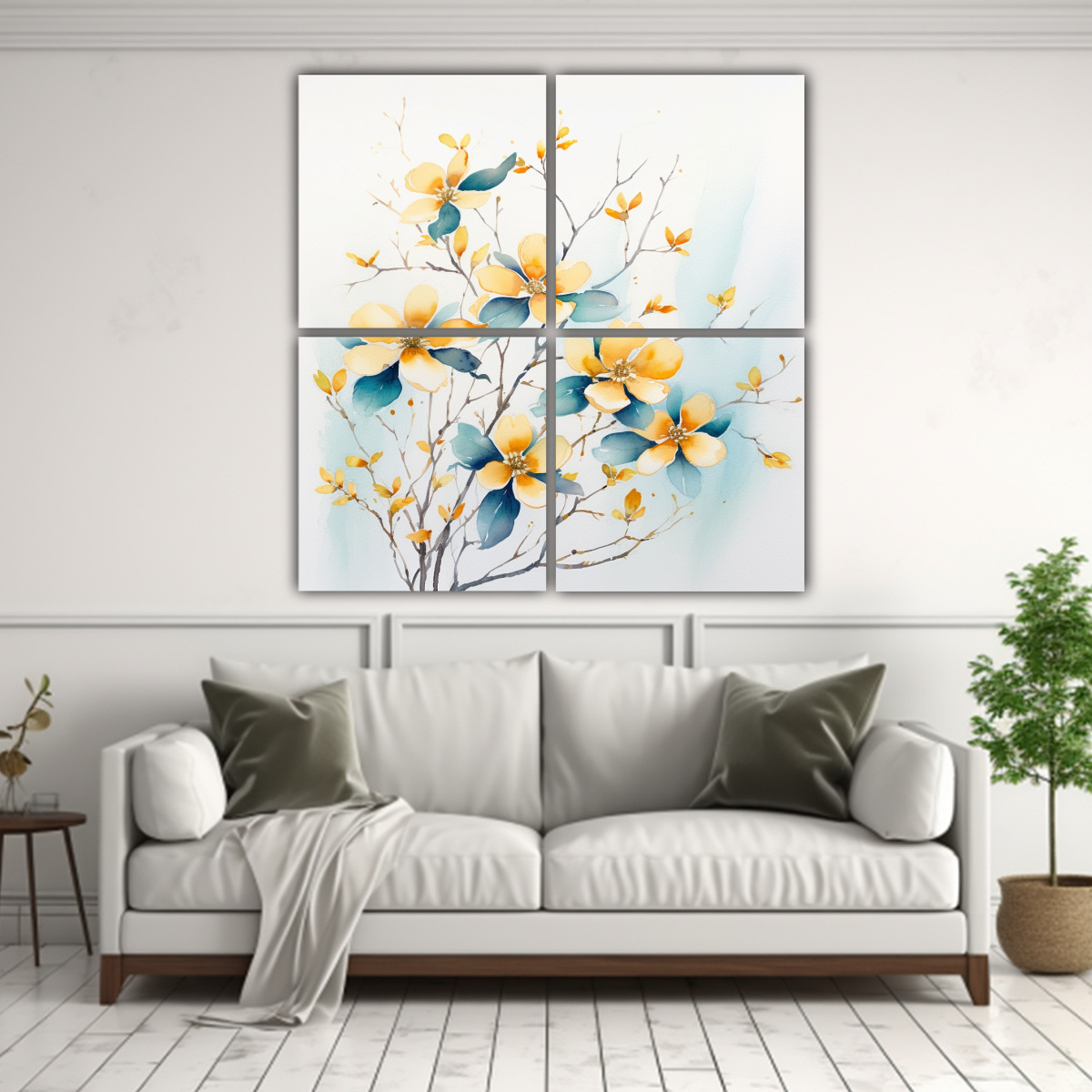 Decora tu hogar con este cuadro de alta calidad con múltiples ramas de flores de cornejo en acuarela Impreso en tela de alta calidad con bastidores de madera, este cuadro tiene un diseño exclusivo de nuestra tienda Resalta la belleza de tu espacio con los colores verde azulado, beige, coral, gris, chocolate, amarillo claro, plateado y turquesa que encontrarás en esta pintura de decoración Además, disfruta de los precios más económicos del mercado y las entregas más rápidas y gratuitas en Santiago, con envíos express a regiones