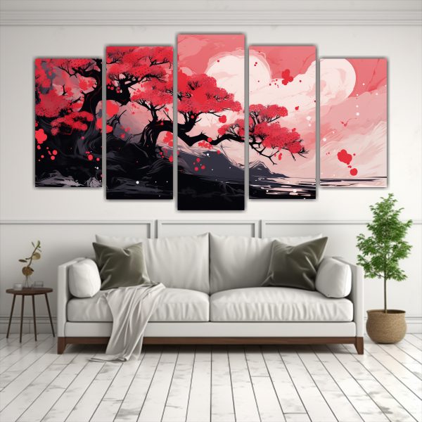 Pintura De Decoración De Cinco Telas En Bastidor De Dibujo Creatividad De Un árbol De Cottonwood En Colores Rojo Y Negro, Atmósfera Neonoir.