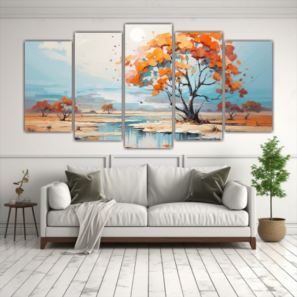 Pintura De Decoración Horizontal En Lienzo, Juego De 5, Armonía Cromática De La Sabana Y árbol Del Desierto En Colores Turquesa Y Naranja.