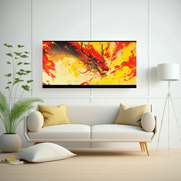 Este cuadro de Dragón en Amarillo y Rojo sería ideal para decorar tu sala de estar o estudio, creando un ambiente moderno y sofisticado Combínalo con muebles en tonos neutros para resaltar su vibrante paleta de colores