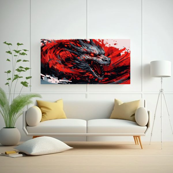 Combina el cuadro ‘Dragon en Rojo y Negro’ en tu sala de estar para crear un ambiente misterioso y elegante Colócalo sobre un mueble oscuro para resaltar los tonos rojos y negros, y acompáñalo con detalles en gris y beige para un contraste sofisticado