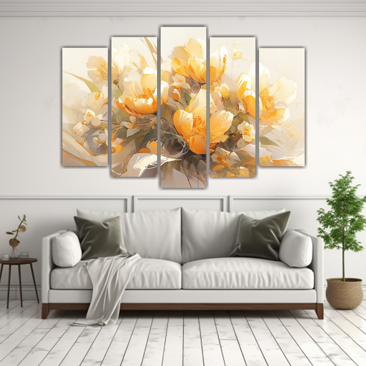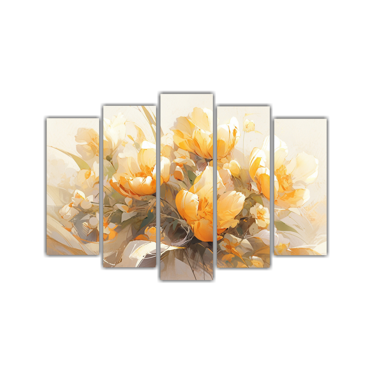 Pintura De Flores Amarillas Y Doradas En Tela Canvas De 5 Paneles