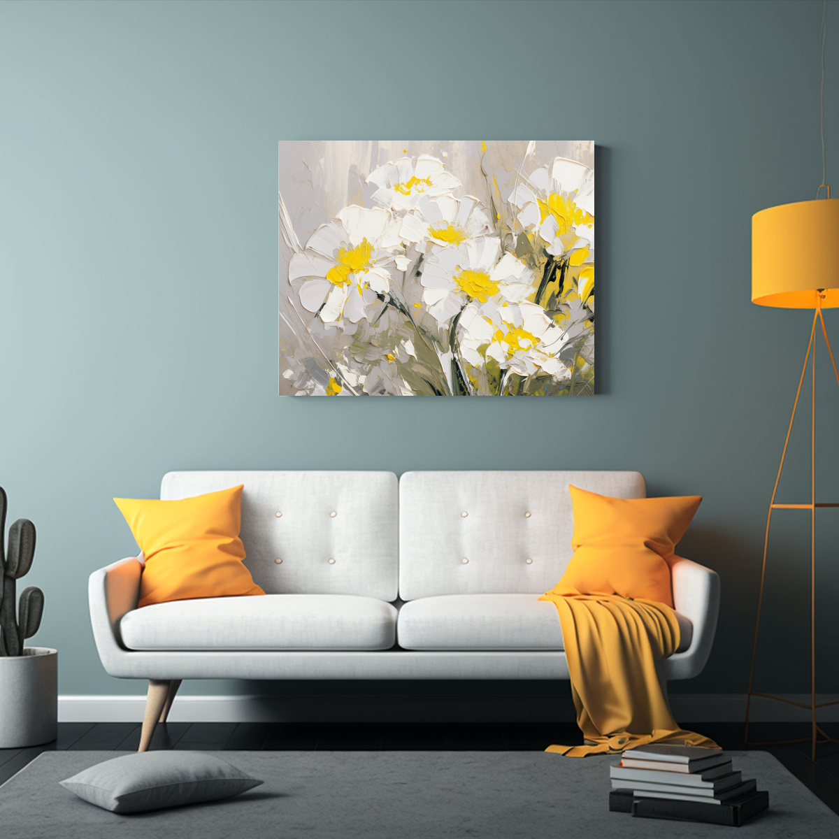 Este cuadro de flores amarillas y plateadas en lienzo quedará perfecto en tu sala de estar sobre un sofá de color neutro o en el dormitorio combinado con cojines en tonos mostaza y gris Atrévete a mezclar texturas y formas para lograr un ambiente acogedor y elegante