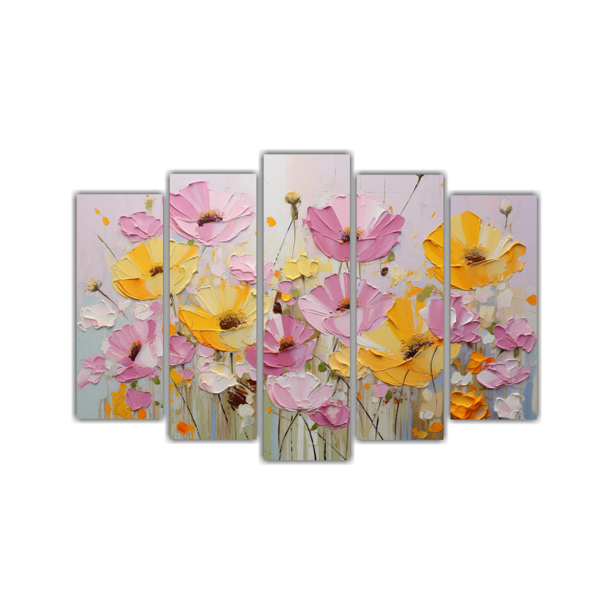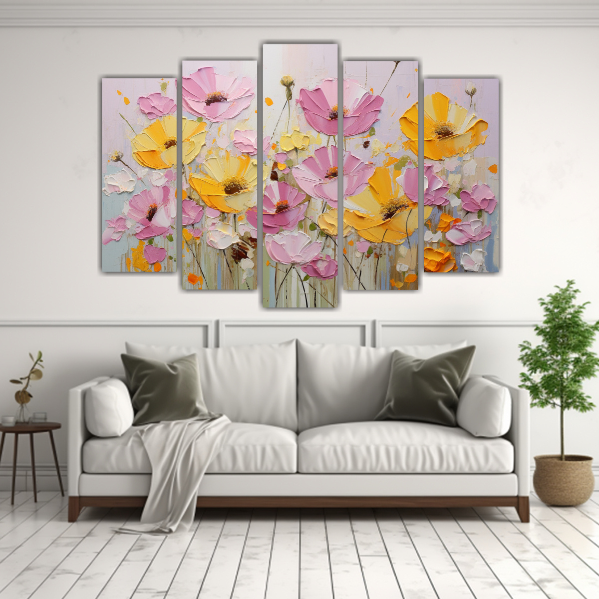 Pintura De Flores Amarillas Y Rosas En Lienzo Para Decoración.