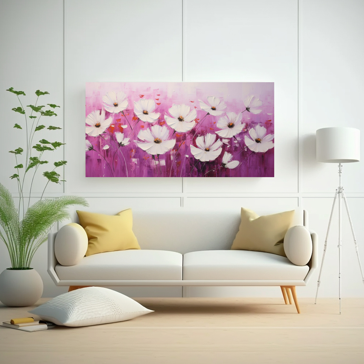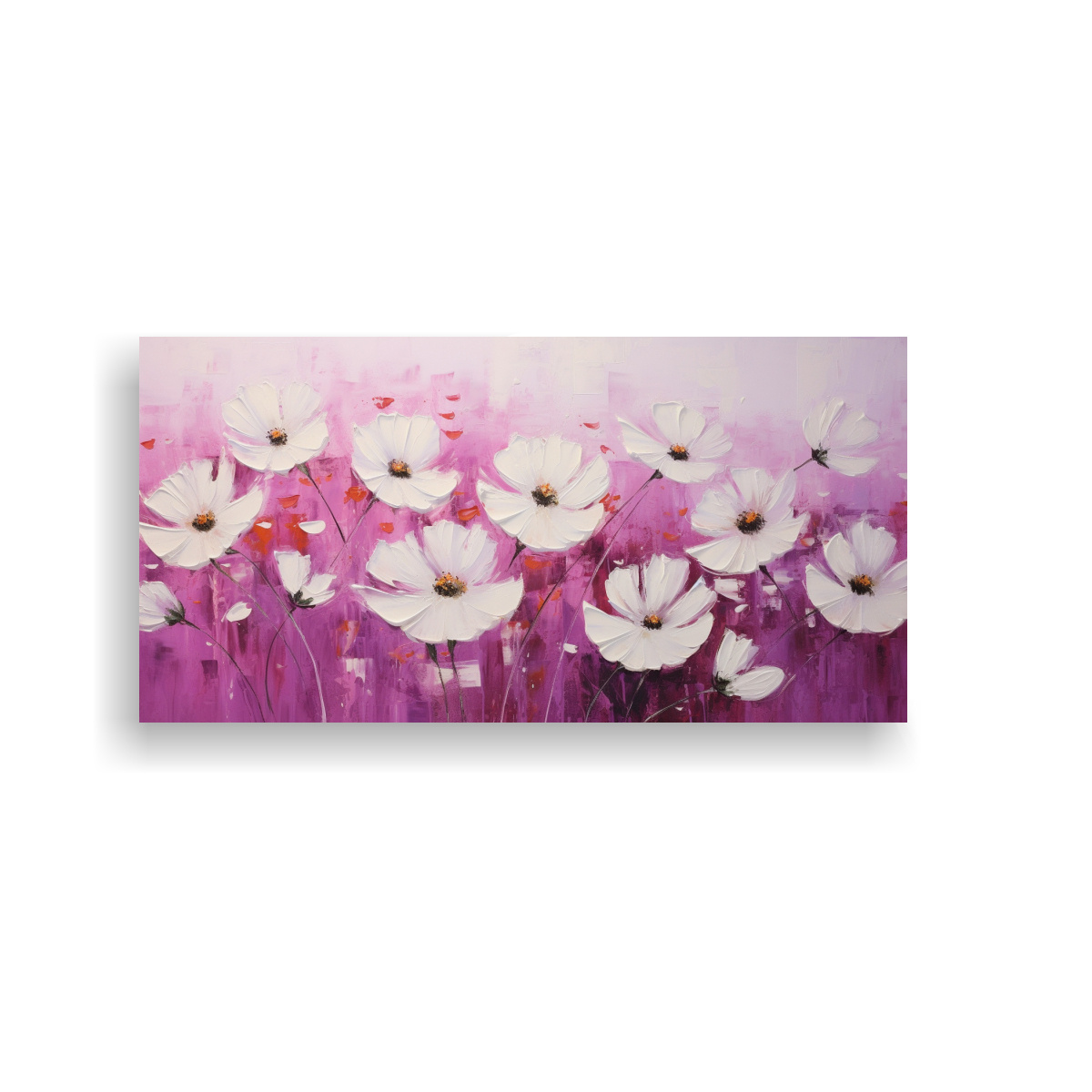 Este cuadro de Flores en Colores Blanco Y Magenta encaja perfectamente en una sala de estar o en un dormitorio de tonos neutros, como blanco, gris o beige Colócalo sobre una pared de color claro para resaltar los colores vibrantes de la pintura y crear un punto focal Complementa la decoración con cojines o cortinas en tonos similares y agrega elementos en plateado para dar un toque de elegancia ¡Transforma tu espacio con esta hermosa obra de arte!