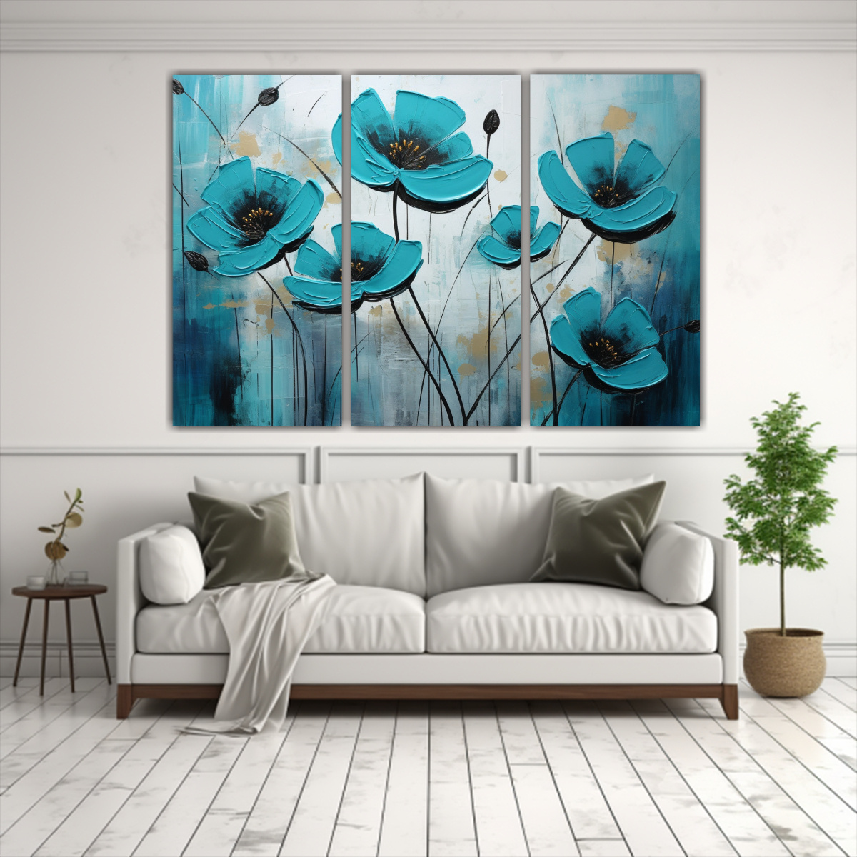 Este cuadro de flores en tonos turquesa y negro luciría espectacular en una pared blanca, creando un impacto visual impresionante Combínalo con muebles en tonos neutros para resaltar su belleza y añadir un toque de frescura a tu espacio ¡Atrévete a decorar con estilo y personalidad!