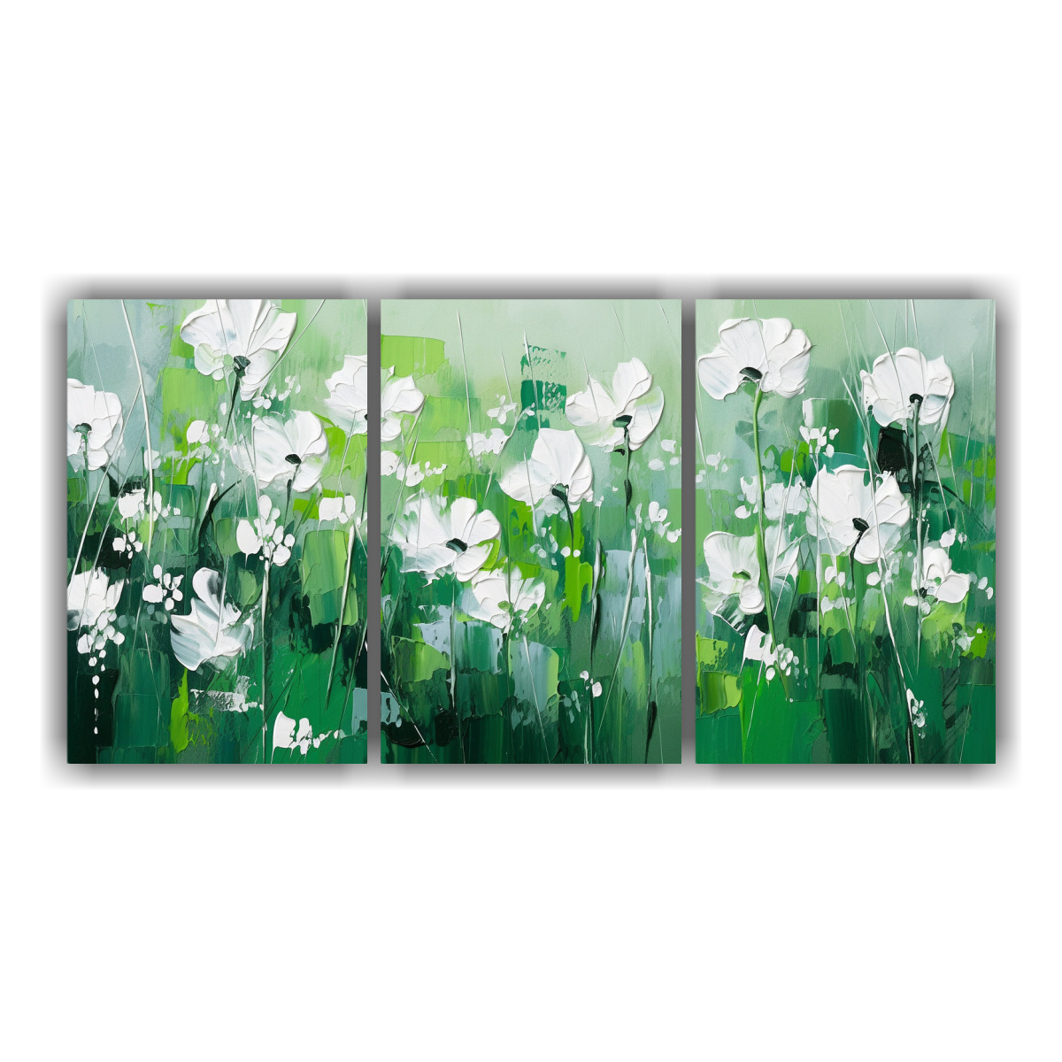 Pintura De Flores En Lienzo Estilo Galería Verde Y Plata En Tres Artes De Pared