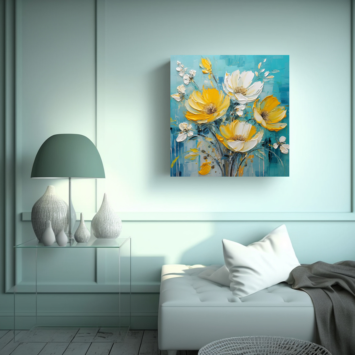Este cuadro de flores en lienzo en colores amarillo y verde azulado sería perfecto para decorar tu sala de estar Puedes colgarlo sobre un sofá de color neutro para crear un contraste armonioso y darle vida a la habitación También puedes combinarlo con cojines en tonos mostaza y verde azulado para lograr una estética cohesionada y fresca