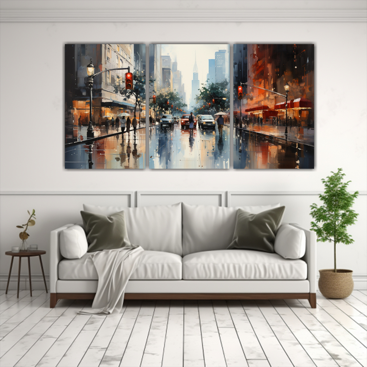 Decora tu hogar con el Set 3 Cuadros Inspiración Minimalismo de DecoCuadros Estos cuadros impresos en tela de alta calidad con bastidores de madera representan una animada calle urbana Combina colores plateado, azul marino grisáceo, dorado, gris, coral y carmesí para darle un toque moderno y elegante a tus espacios Con la mejor calidad del mercado y precios económicos, DecoCuadros te ofrece diseños únicos y entrega gratuita en Santiago
