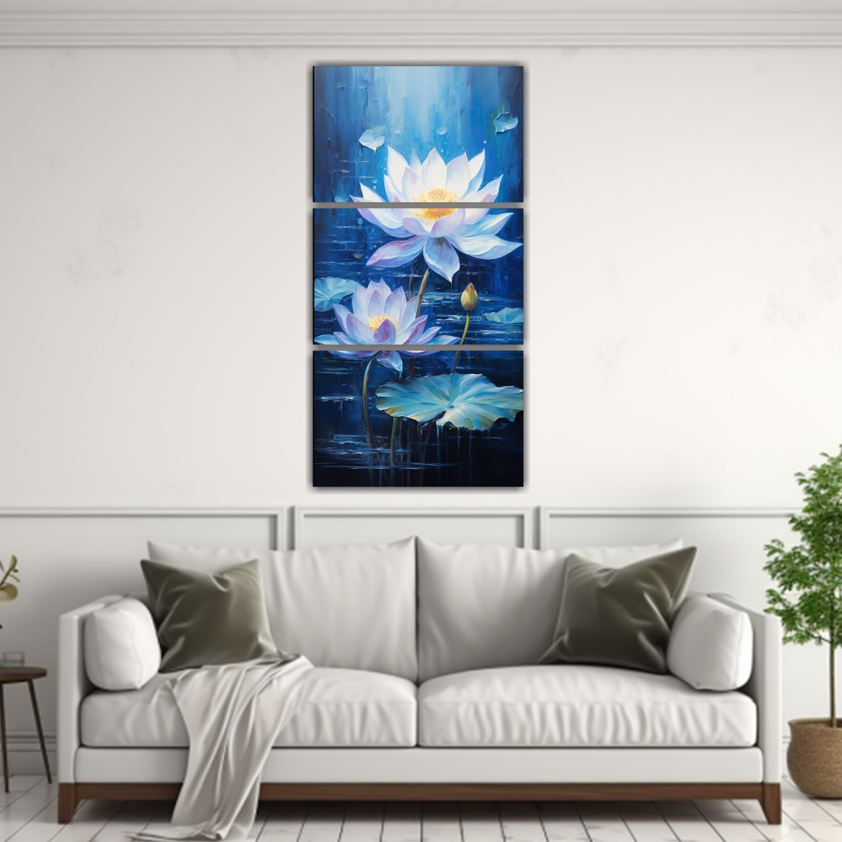 Este cuadro de Pintura de Loto Azul en lienzo se vería perfecto en un ambiente de estilo moderno o minimalista, en una pared blanca para resaltar sus tonos azules y plateados Combínalo con muebles en tonos neutros para un efecto elegante y armonioso