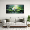 Este cuadro de loto verde en lienzo sería perfecto para decorar tu sala de estar Colócalo sobre el sofá principal para crear un punto focal en la habitación Combínalo con cojines en tonos verde y dorado para resaltar los colores del cuadro Agrega una lámpara de pie con pantalla en tonos neutros para iluminar el espacio y resaltar la belleza de la pintura ¡Tu sala de estar lucirá elegante y sofisticada con este cuadro de loto verde!