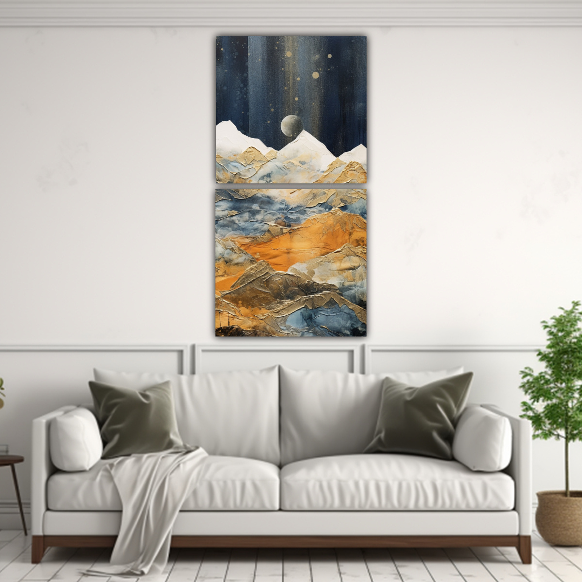 Decora tus espacios con el cuadro ‘Pintura de paisaje con montañas y cielo azul: Set 2 Artes Moderno Protagonismo’ Colores: Azul Marino grisaceo, Plateado, Gris, Dorado, Coral, Carmesi Calidad y precio inigualables en DecoCuadros Envío gratis en Santiago y envíos express a regiones