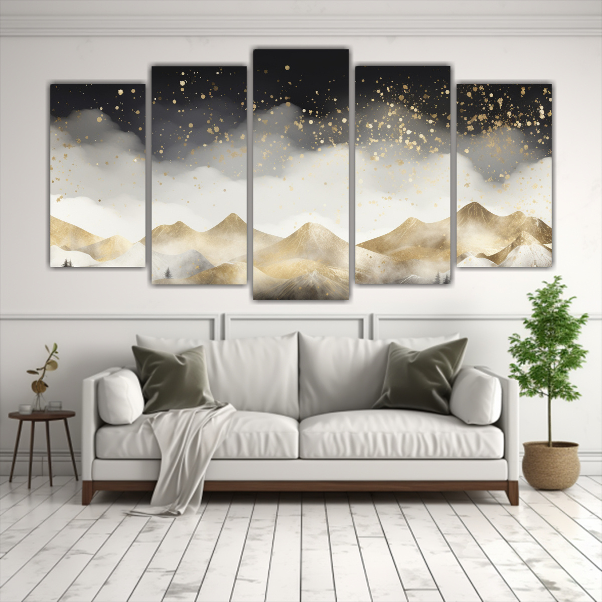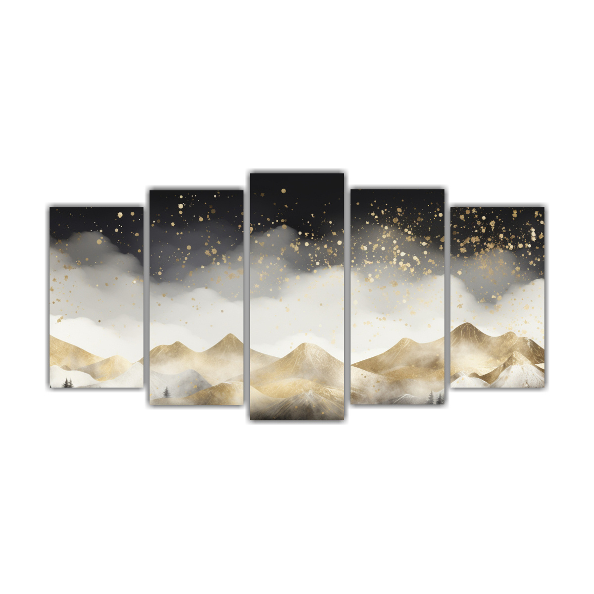 Decora tu hogar con el set de 5 lienzos decorativos de paisaje de montaña, con detalles intrincados y estilo elegante en plateado, gris y azul marino grisaceo DecoCuadros ofrece cuadros impresos en tela de alta calidad con bastidores de madera, con diseños exclusivos y los precios más baratos del mercado Disfruta de entregas rápidas y gratuitas en Santiago y envíos express a regiones
