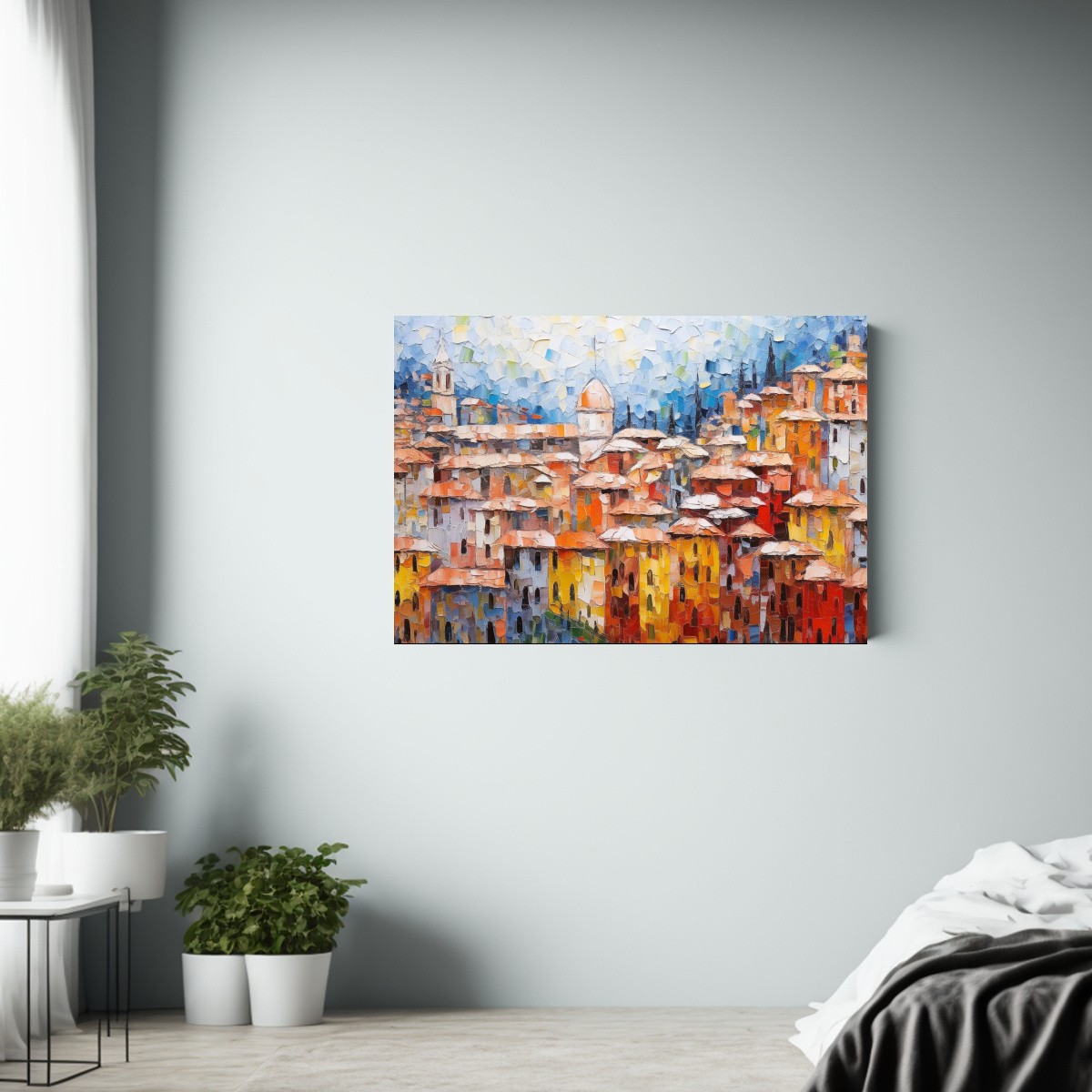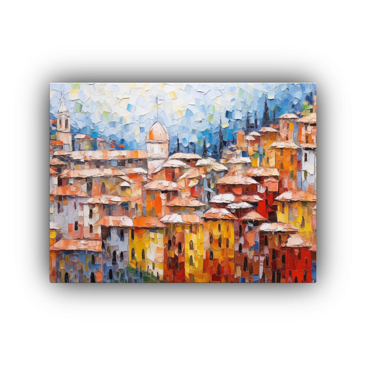 Este cuadro de paisaje urbano colorido y grueso quedará espectacular en tu sala de estar, creando un punto focal moderno y sofisticado Combínalo con muebles en tonos neutros y accesorios en colores similares para lograr un ambiente equilibrado y acogedor