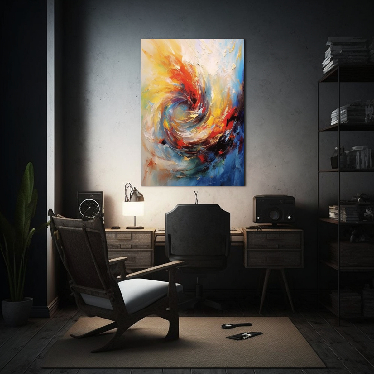 Coloca la Pintura de Pared Abstracta Danza de Luz en tu sala de estar para crear un ambiente moderno y elegante Combina este cuadro con muebles de tonos neutros como gris o beige, y agrega cojines y accesorios en los tonos del cuadro para lograr una armonía perfecta en tu decoración